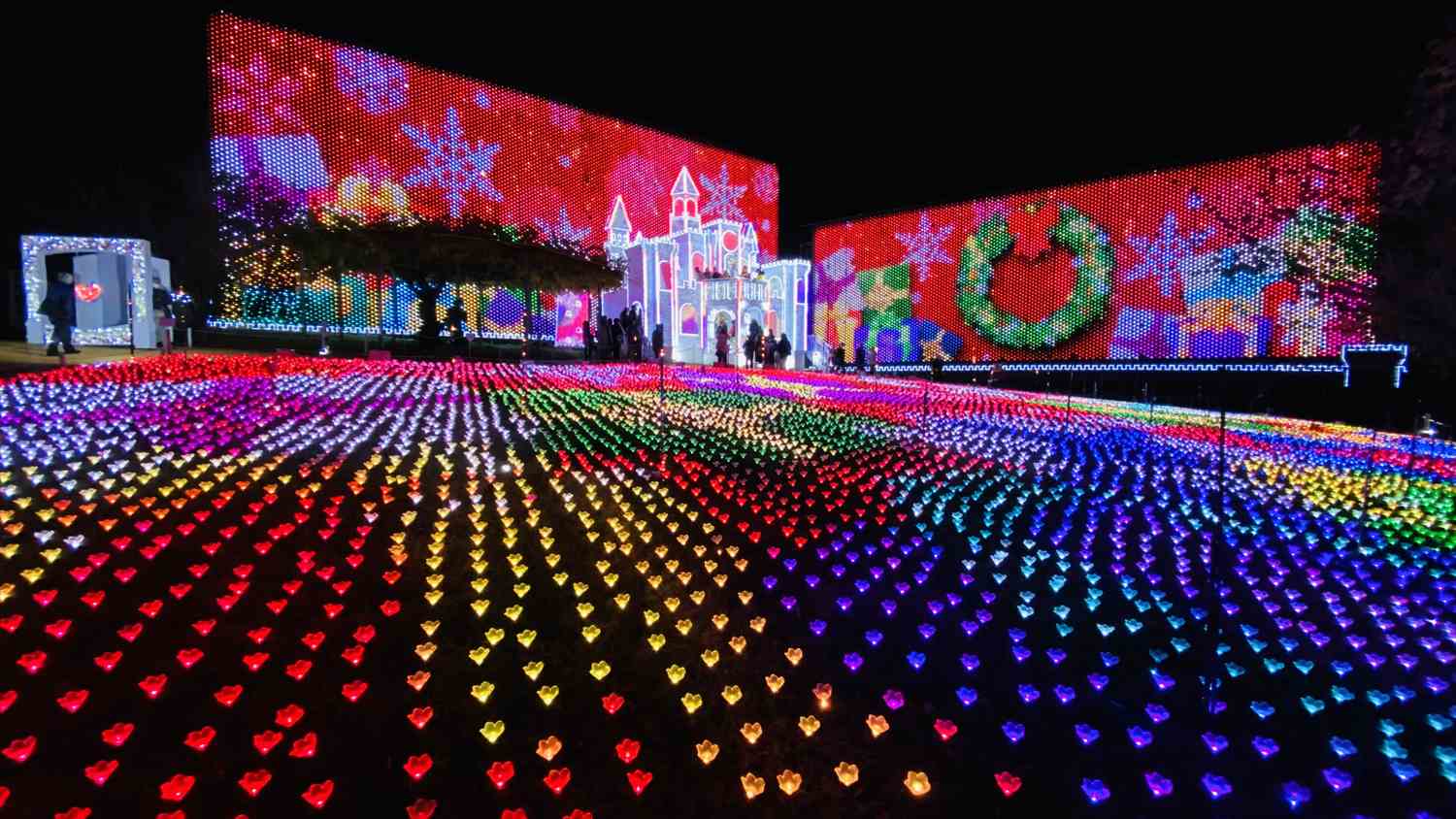 バラをイメージしたイルミネーションが立体的に広がり、イベントのコンセプト「光の花の庭」にふさわしい人気スポットです。展望台ではローズの香り演出も加わり、イルミネーションと香りを同時に体験できます。幅120mの光の壁画も圧巻!