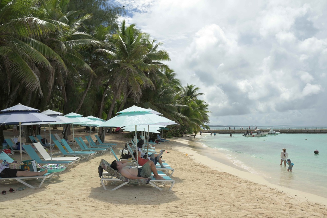 午前中はガラパンの港から15分ほどフェリーに乗ってマニャガハ島へ。サイパン島西側にある無人島で、白砂が輝くビーチはサイパンで最もきれいともいわれています。パラセーリングやバナナボートなどマリンアクティビティが料金に含まれているパッケージツアーなどもありますが、熱帯の植生を感じながら島内をぐるりと15分ほどかけて散策したり、ビーチでのんびり過ごすのもおすすめ。遊泳区域は遠浅かつ波はおだやかで、魚の姿が見られることも。島内にはシャワーとトイレ、簡単な売店、レジャーグッズのレンタル店も完備しています。