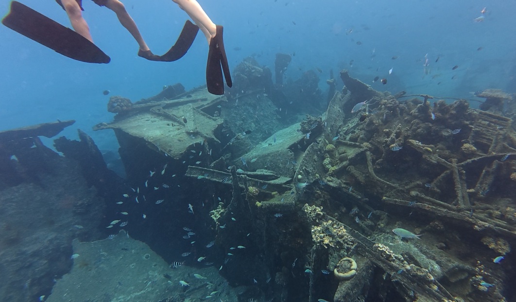 午後はサイパンの代名詞であるマリンアクティビティへ。高い透明度を誇るサイパンの海はシュノーケルでも十分に楽しめます。船で沖合へわずか10分。世界でも珍しい「沈没船ポイント」でシュノーケリングを楽しめます。全長123mの巨大な船の遺構は迫力満点!高い透明度を誇る海の中、カラフルな熱帯魚の群れや、光のカーテンを悠々と泳ぐウミガメとの遭遇に、感動が止まりません。