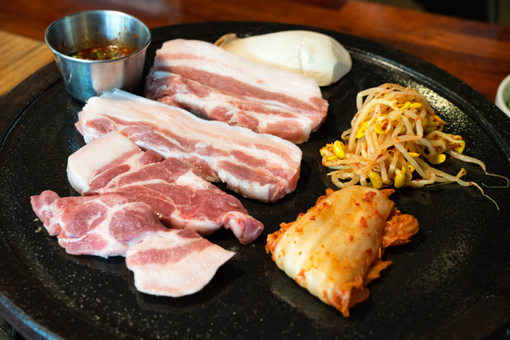 済州島は黒豚の産地として知られています。人気の黒豚料理のひとつが、黒豚の焼肉。済州では皮付きのバラ肉を使用し、鉄板でイワシの塩辛を温めて肉に付けて食べるとうま味がアップします。