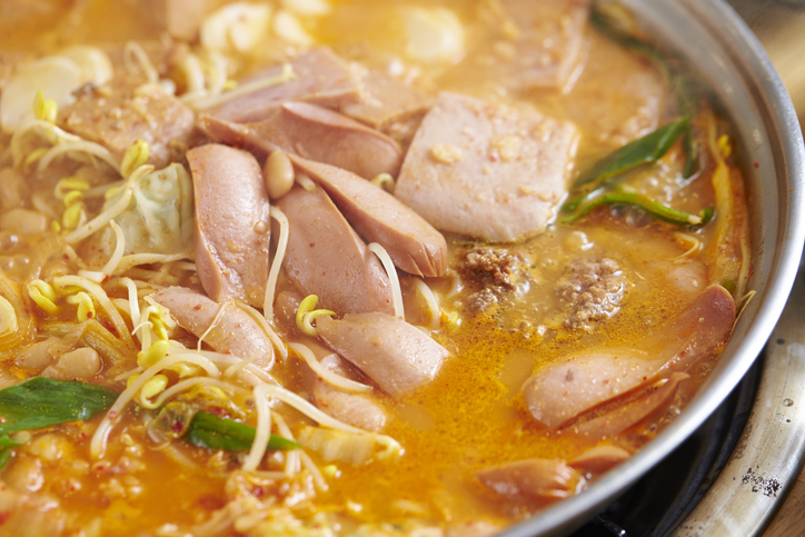 プデチゲとは、キムチなどを煮込んだチゲ(たくさんの具材を濃厚なスープで煮込んだ鍋)に、ソーセージやスパム、ラーメン、チーズなどを加えた料理。プデチゲのプデとは「部隊」を意味し、朝鮮戦争以降に米軍から流れてきた加工肉をキムチチゲに入れたことがはじまりだとか。議政府市で生まれ、現在では全国で愛される代表的な鍋料理のひとつとなっています。野菜や餅、麺などを追加でトッピングをすることができ、自分好みにアレンジできるのも魅力。