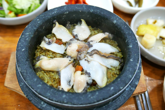 チョンボクトルソッパプは、済州島のアワビがたっぷりと入った贅沢な釜飯。バターをトッピングする食べ方もあります。