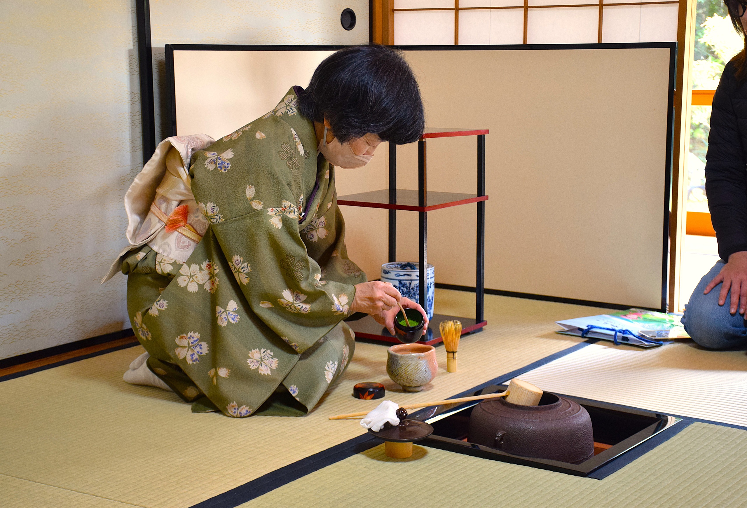 庭園の奥には美しい茶室があり、点茶(てんちゃ)の体験ができます。多くの人にとって、お茶を点てる体験は初めてかと思いますが、ご安心を。まずは先生がお手本となってお茶の点て方を教えてくれます。ひととおり説明を聞いたら、いよいよ本番!
