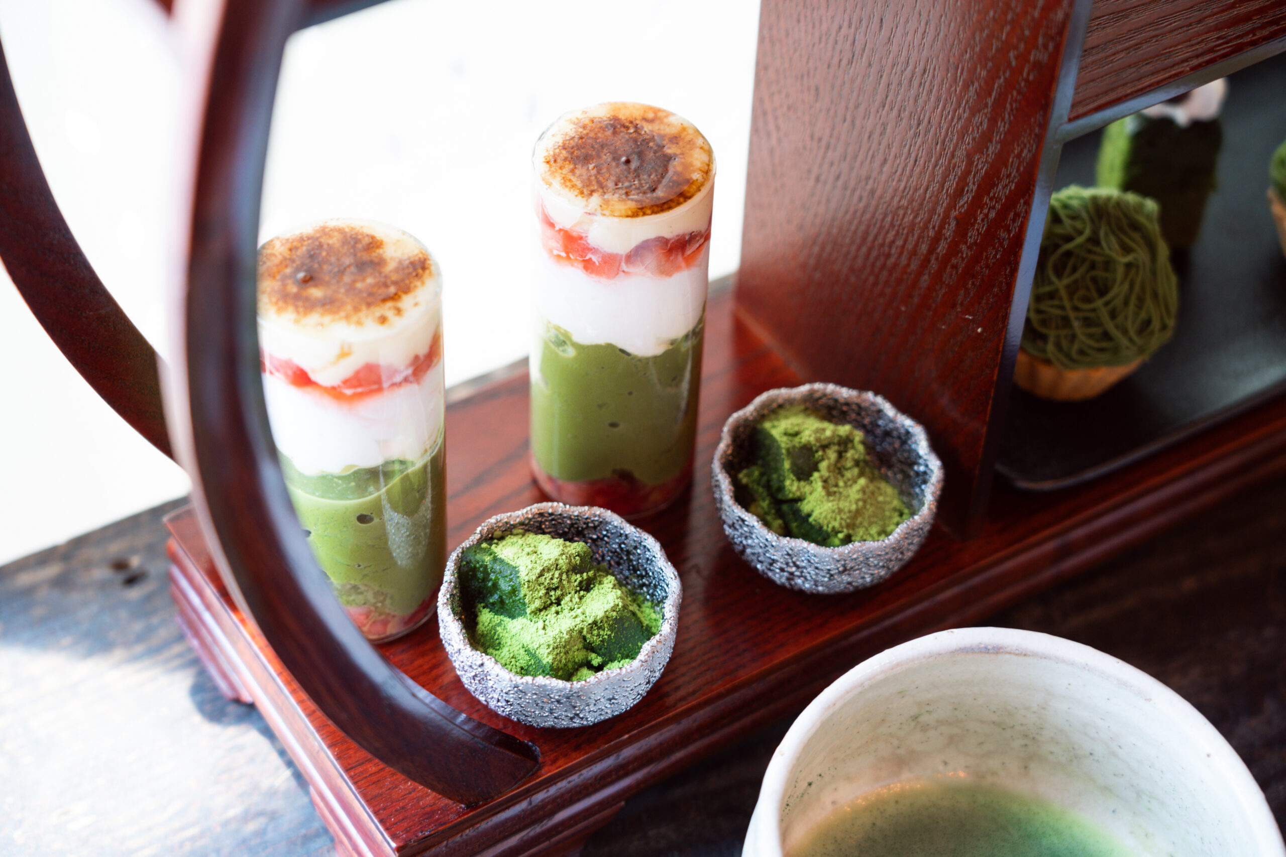 他にも、苺ブリュレと抹茶わらび餅、抹茶ティラミスに抹茶ソフトクリームなど、豊富なラインナップ。抹茶づくしであるにもかかわらず、和洋のメニューであるからか、まったく飽きがこないのが不思議です。
