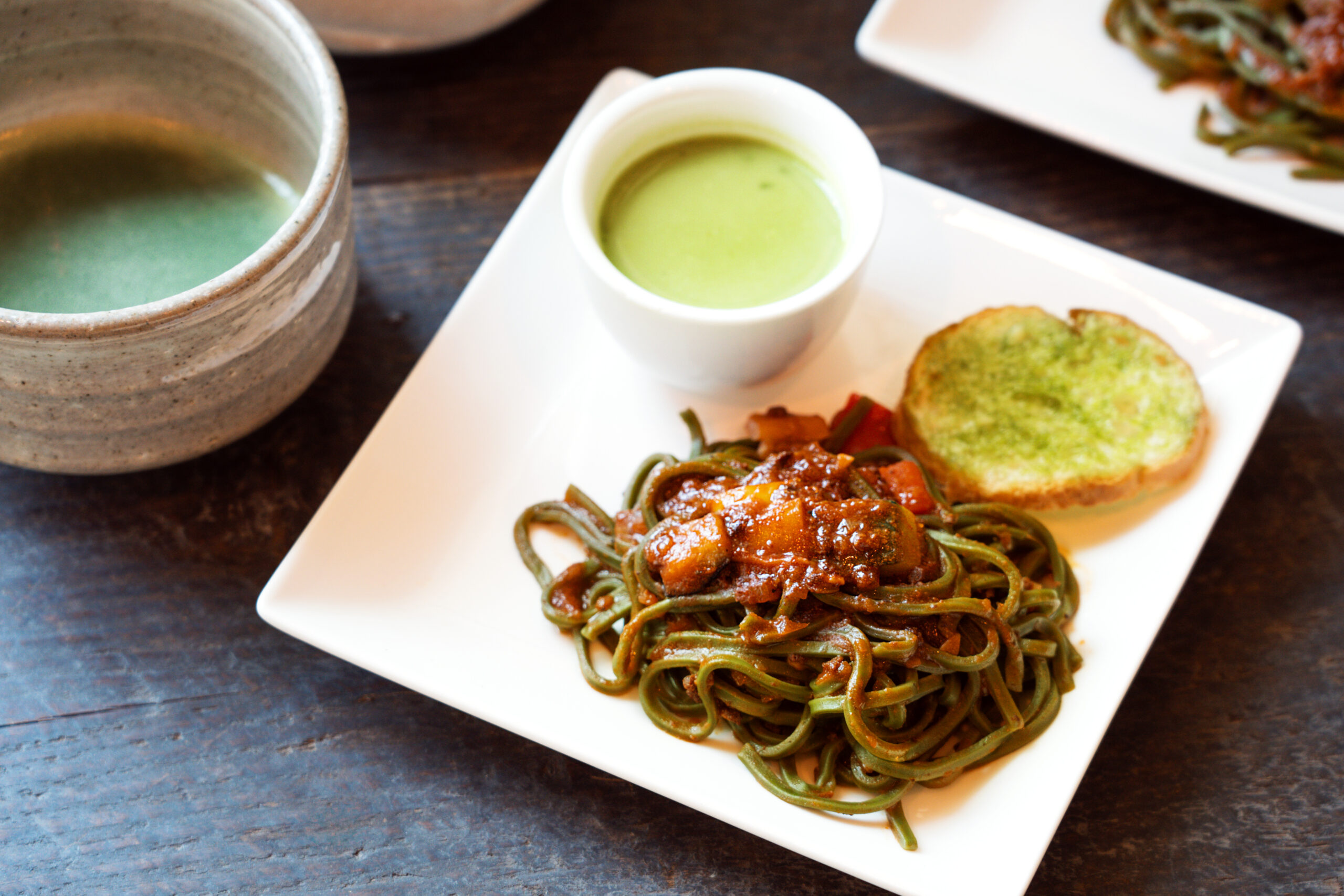 抹茶パスタのボロネーゼ、抹茶ガーリックトースト、さらに抹茶の風味が最も引き立つ配合で仕上げた 抹茶ポタージュ まで。「抹茶」という素材の引き出しの多さに驚かされます。