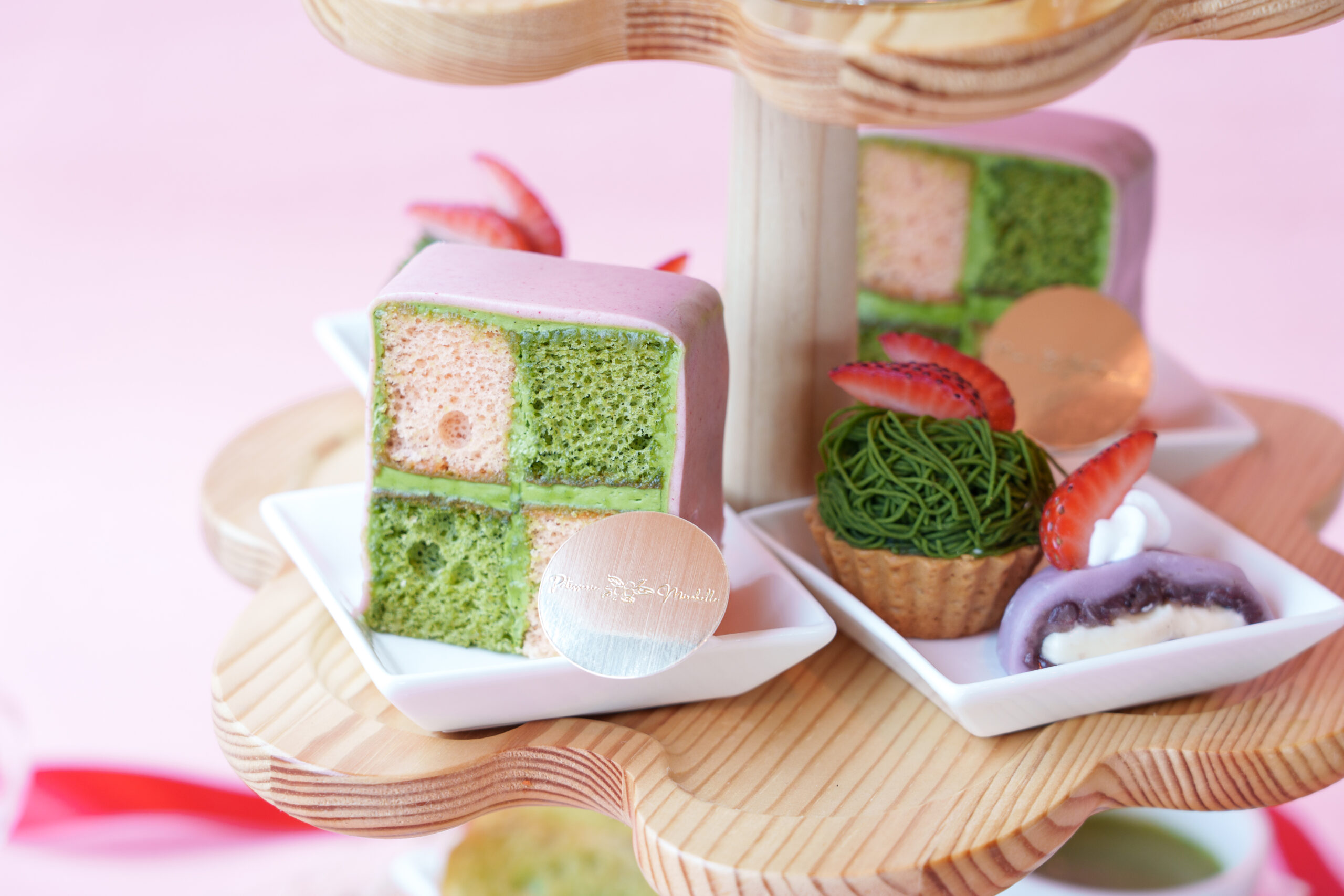 抹茶ティラミスや抹茶モンブランなど、「プレミアム雅」の抹茶スイーツに苺がのっているほか、ブロック型のバタークリームケーキ「抹茶と苺のダミエ」は、このコラボでしか食べられないメニュー!そしてペアリングのお茶が和紅茶になります。