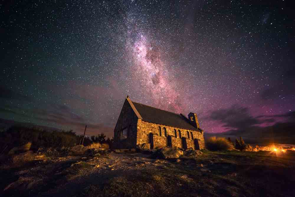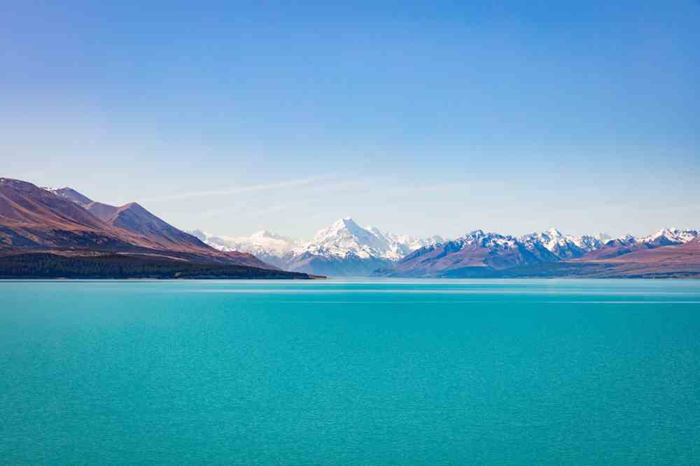 南島の中央部に位置するテカポ湖は、第3の都市クライストチャーチから車で3時間前後とアクセスがよく、ニュージーランドでも人気の観光スポットです。南北約30km、最大水深は120mと大きな湖ですが、日中は湖面がターコイズブルーに見え、奥にはサザンアルプスの山脈が連なります。夜のテカポ湖は世界でも屈指の星空観測スポットとして有名で、地球の歩き方社員の人生ベスト星空にも選ばれています。町からも歩いて気軽に星を見に行くことができるのも魅力です。
