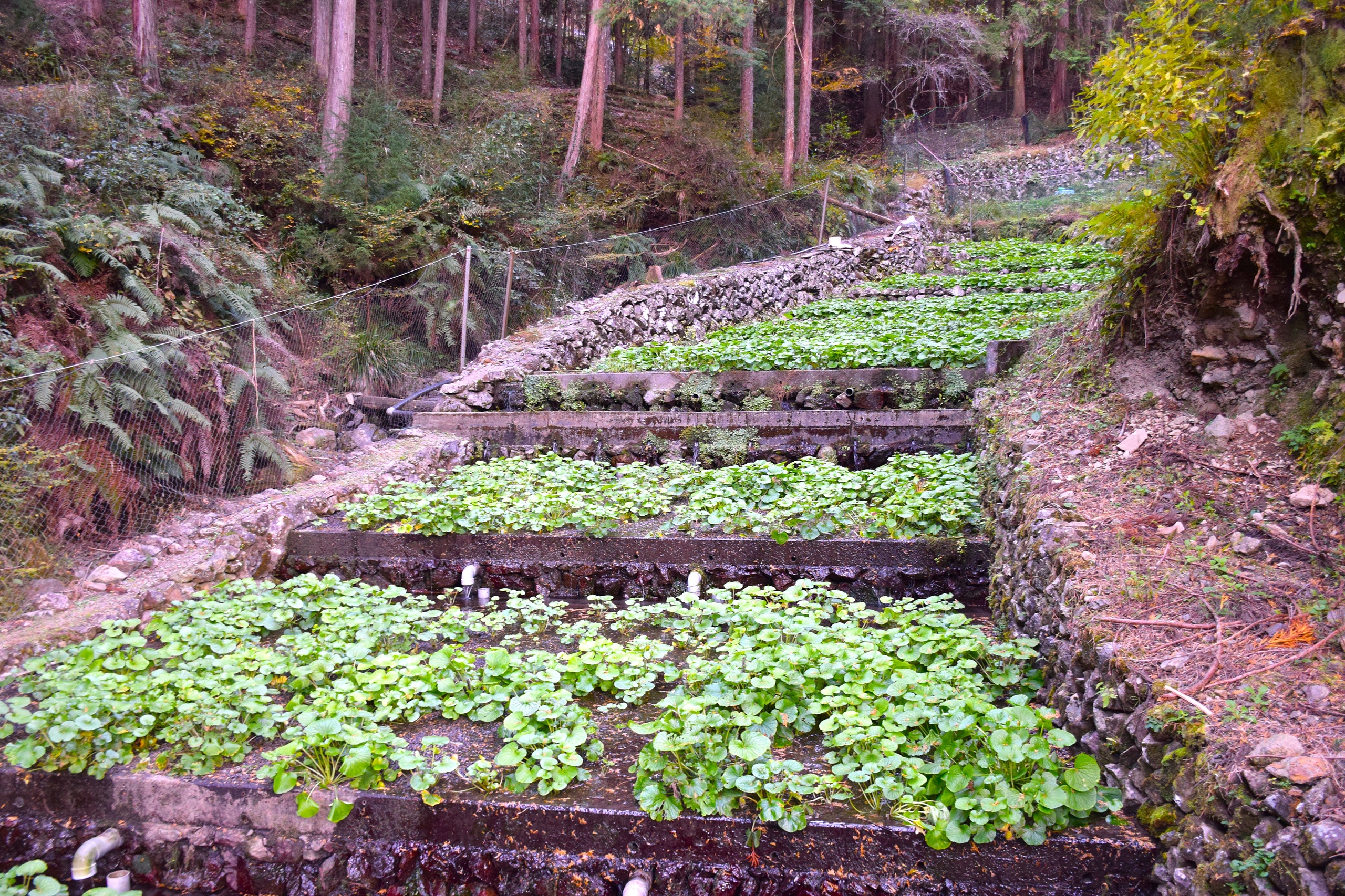 一方で、自然をうまく活用しているのが茶畑のそばにあるわさび田。こちらも志田島園の敷地内にあります。山の斜面を段々に切り出し、湧き水が自然に流れるようにして、いつでもきれいな水と空気がわさびにいきわたるようになっています。