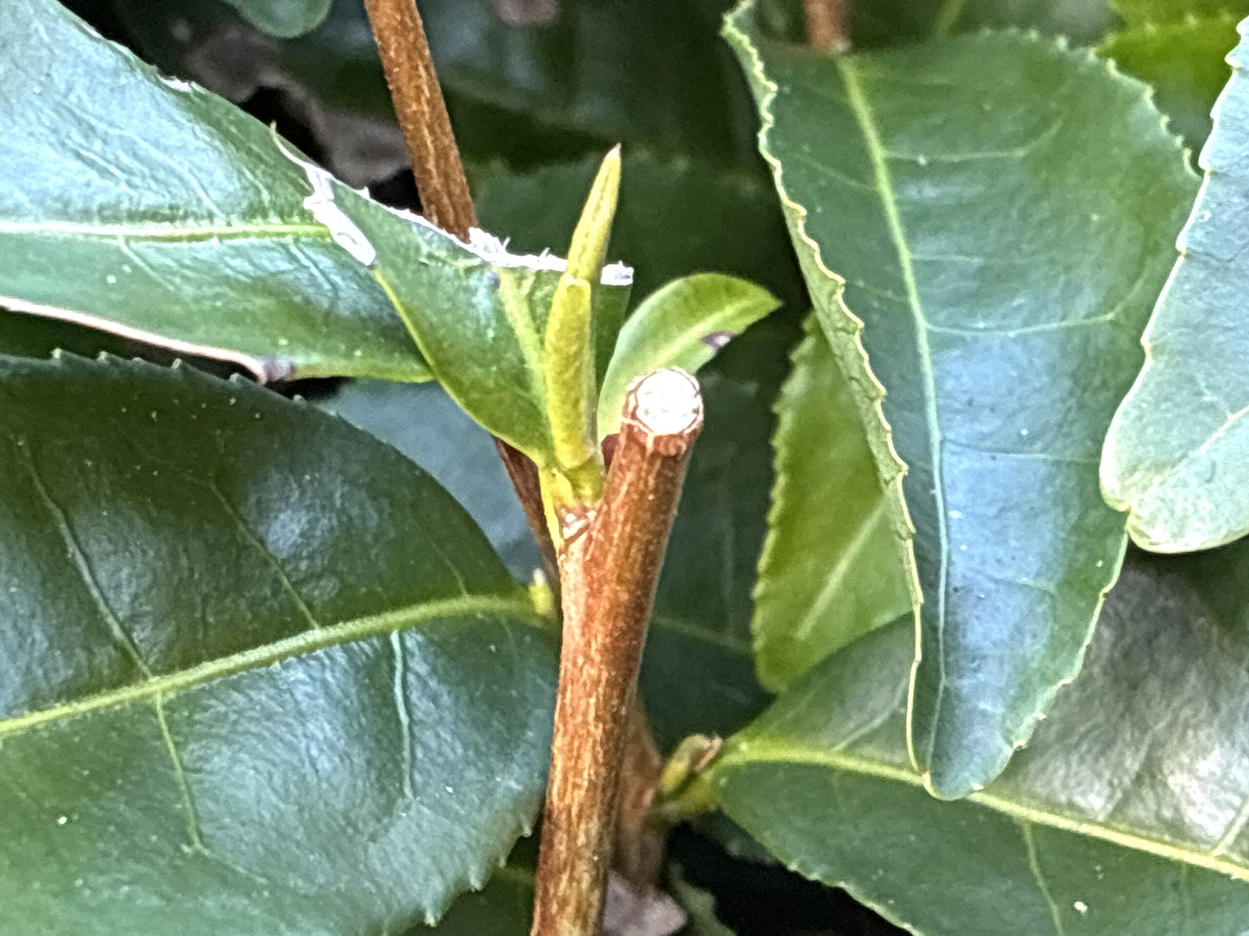 枝先にはよく見ると小さな新芽があり、この芽は冬の氷点下の寒さに耐えることができますが、春になって葉が開き始めると寒さに弱くなり、凍霜害の被害に遭いやすくなるのだといいます。