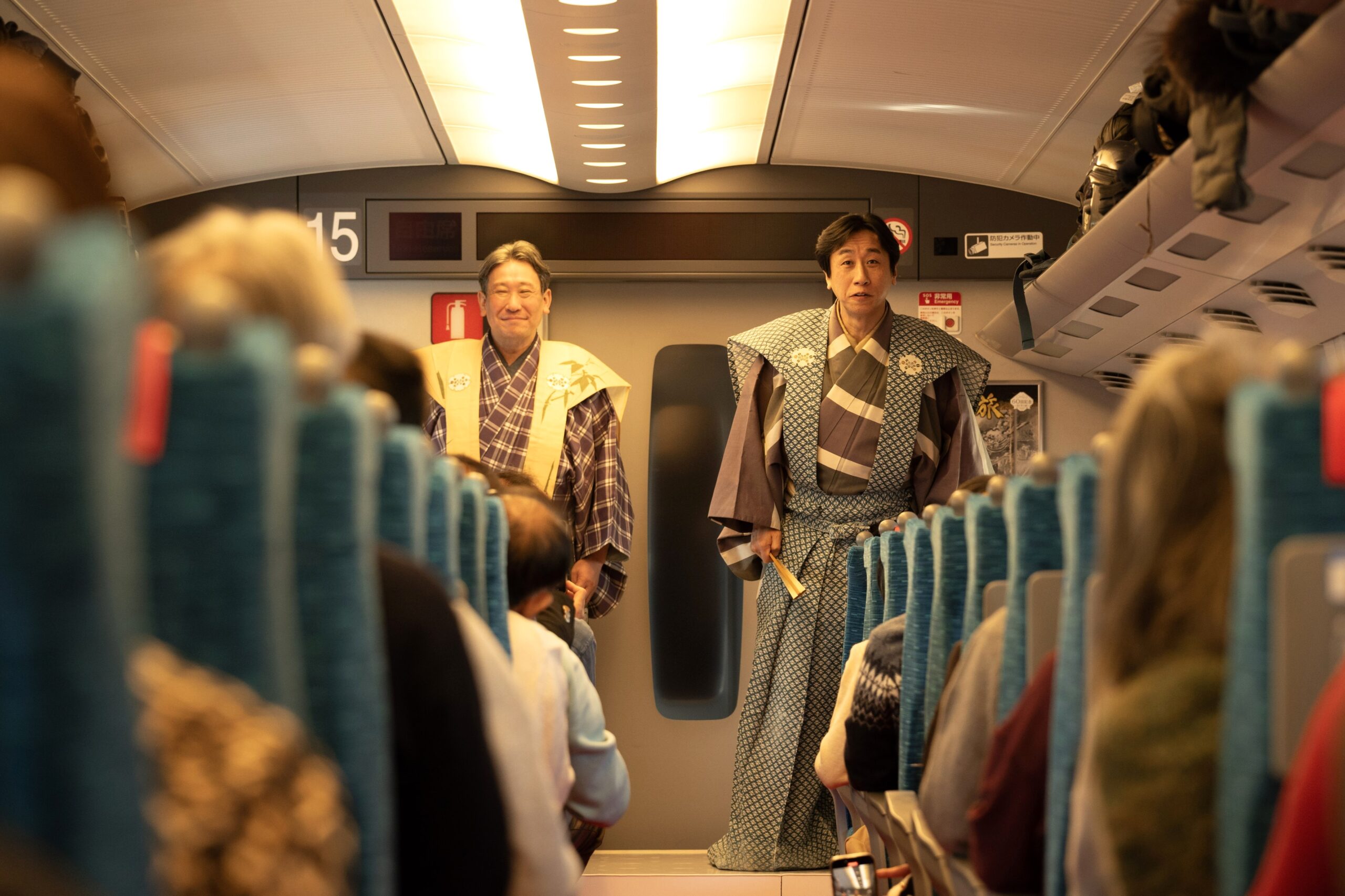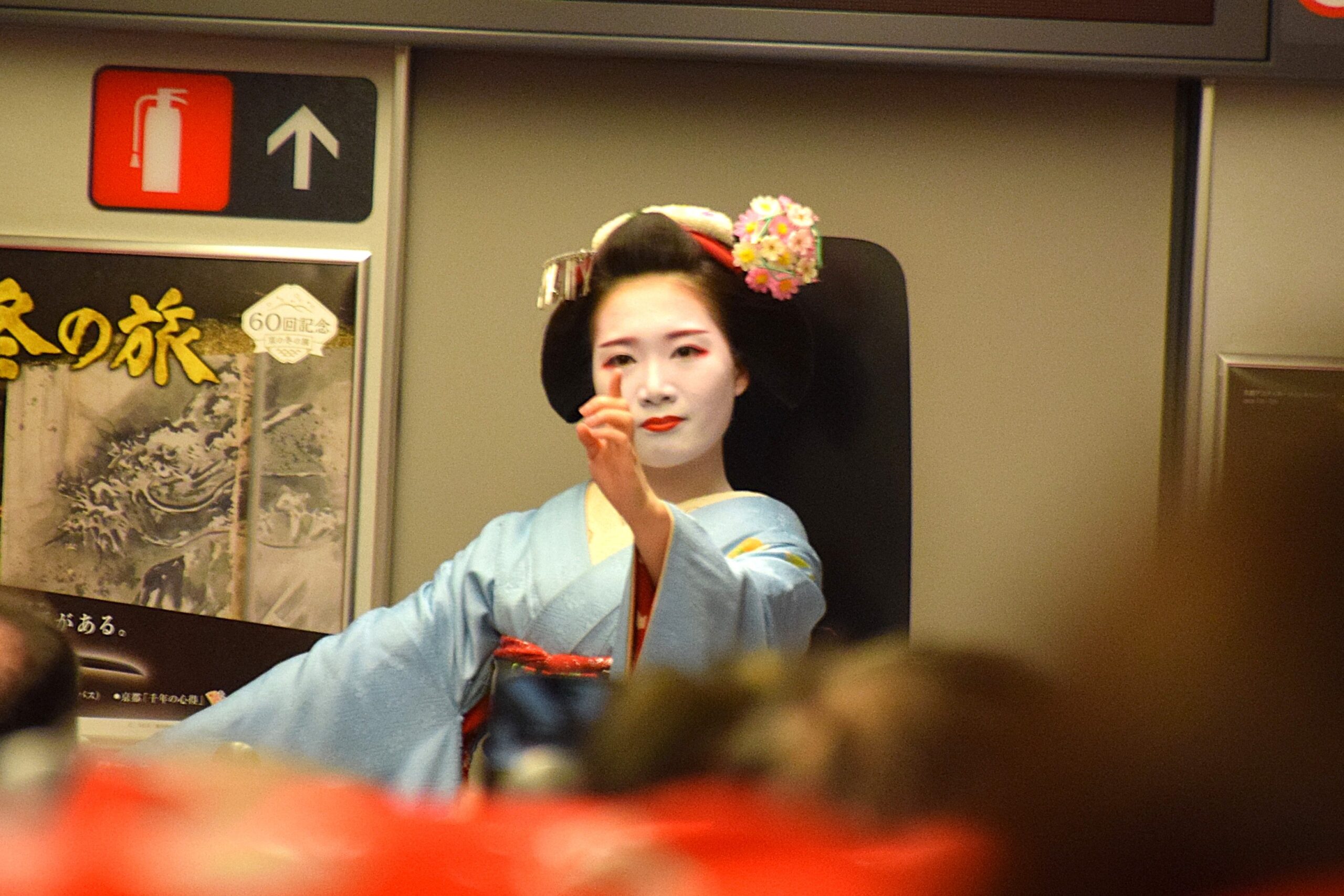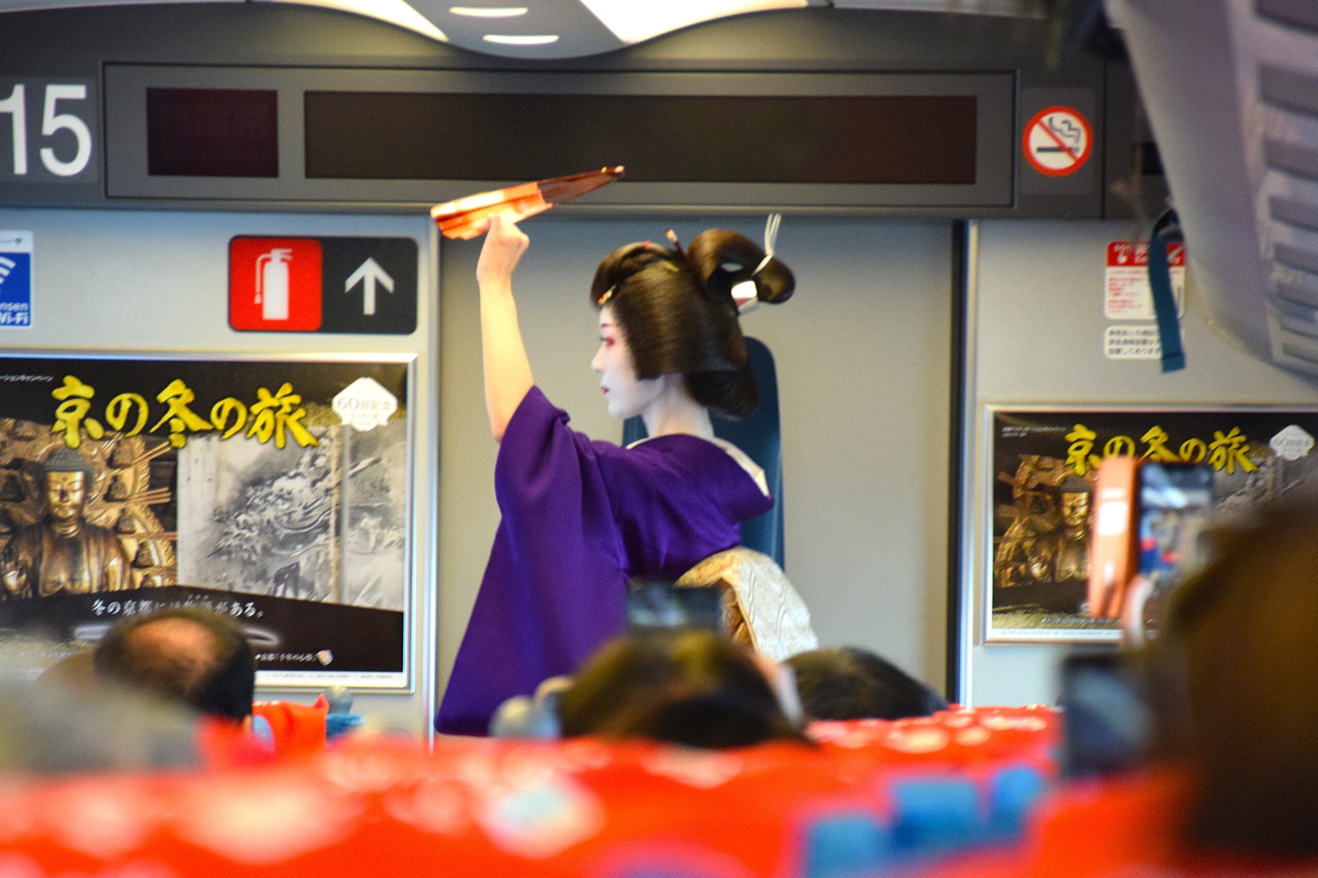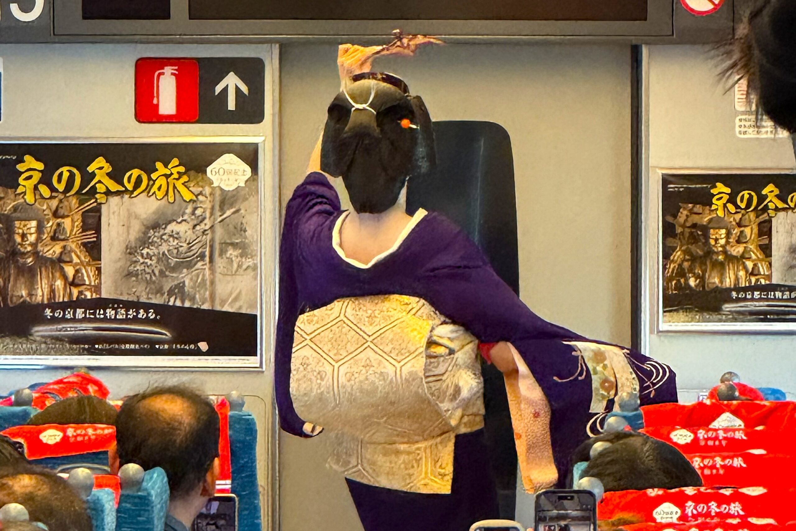 芸妓さん・舞妓さんに詳しくなったところで、披露されたのは「祇園小唄」と「わしが在所」という舞踊。指先や視線にいたるまで洗練された所作に見とれてしまいます。注目したいのは、揺れる新幹線の中でもぶれない体幹と表現力。厳しい稽古のなかで磨かれた技を感じます。