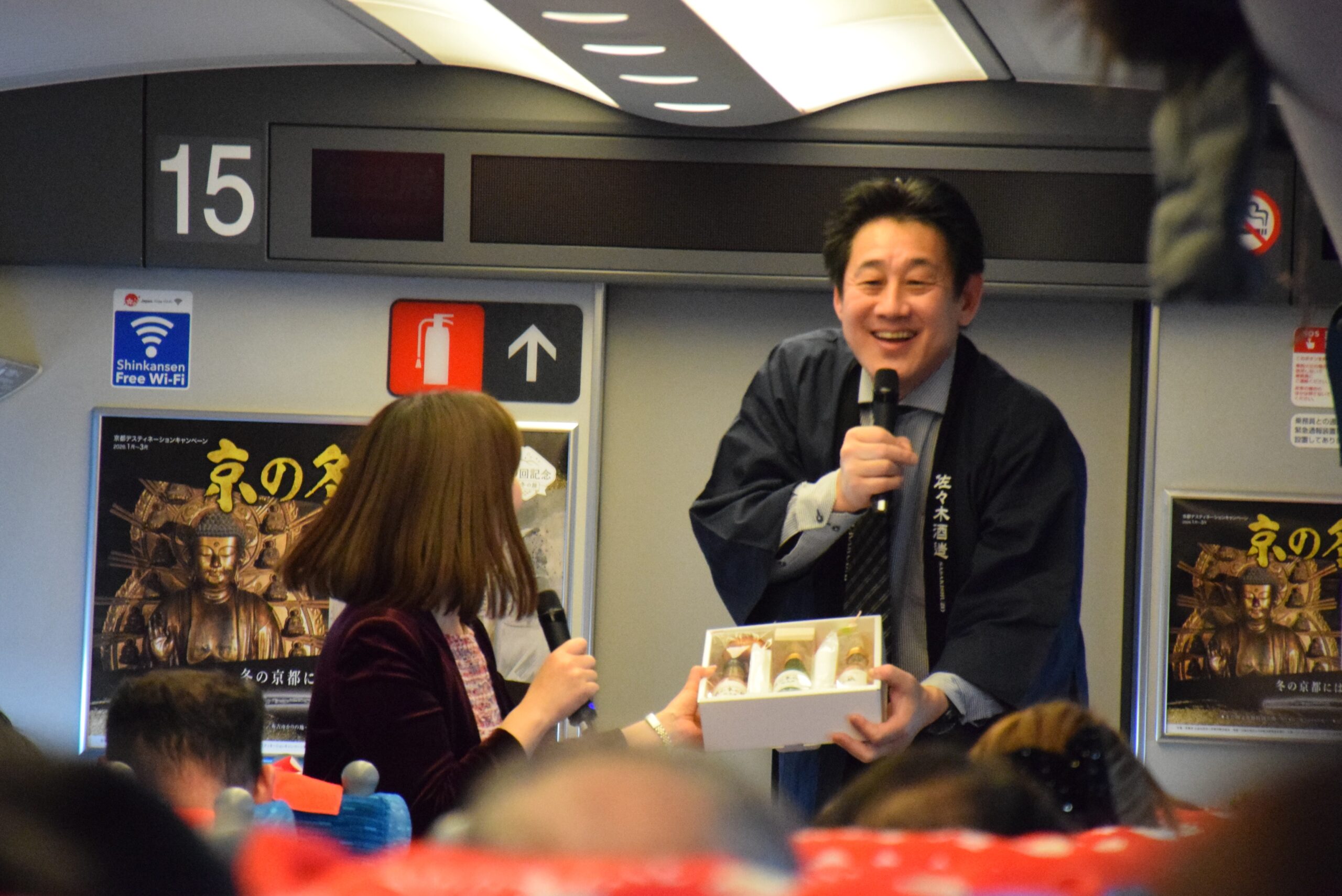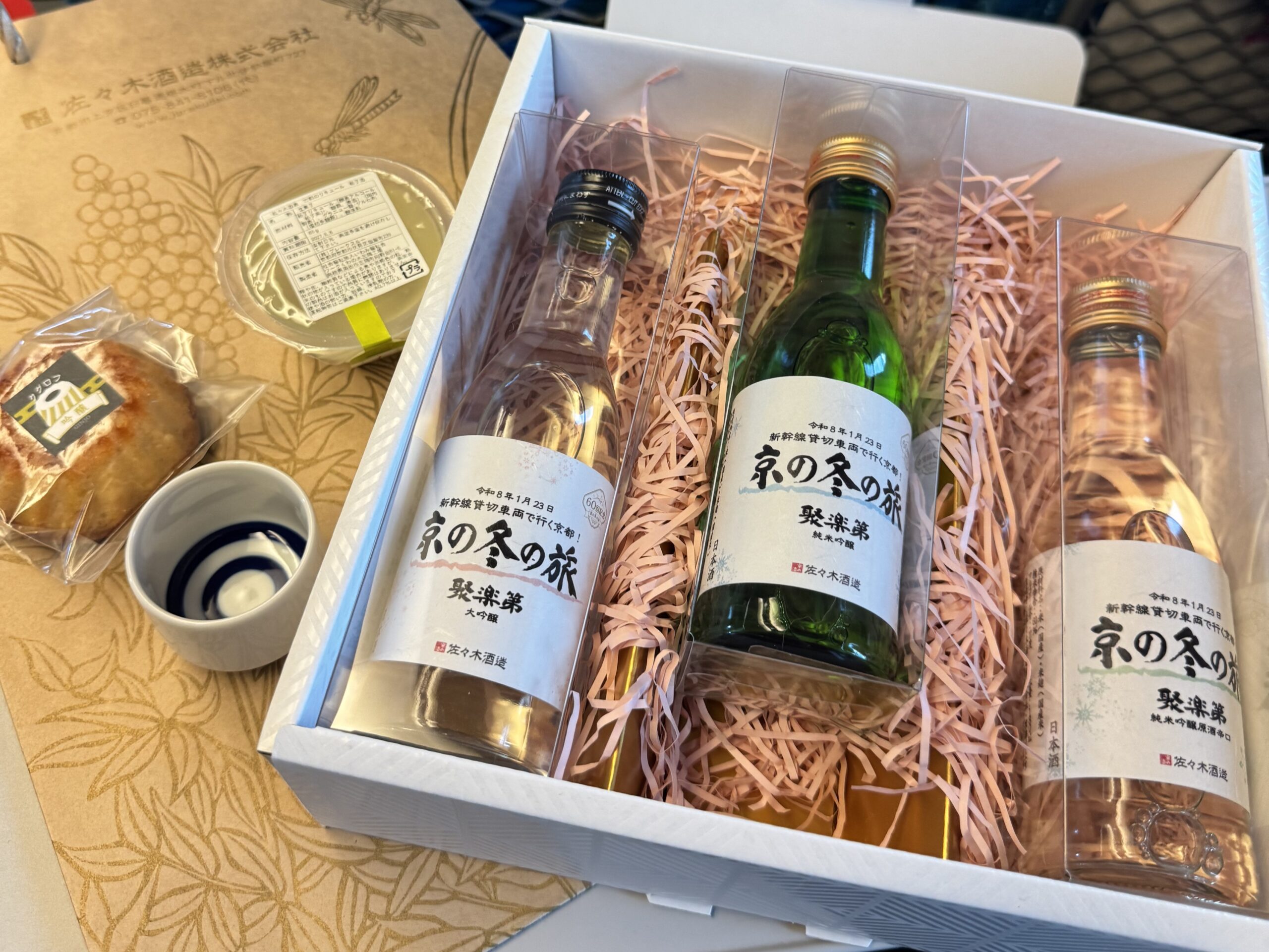 締めくくりは、明治26年創業の佐々木酒造による日本酒講座。4代目当主から、「京の冬の旅」限定の日本酒セットがプレゼントされました。車内でもすぐ飲めるようにぐい呑みおちょこが入っている配慮もさすがです。