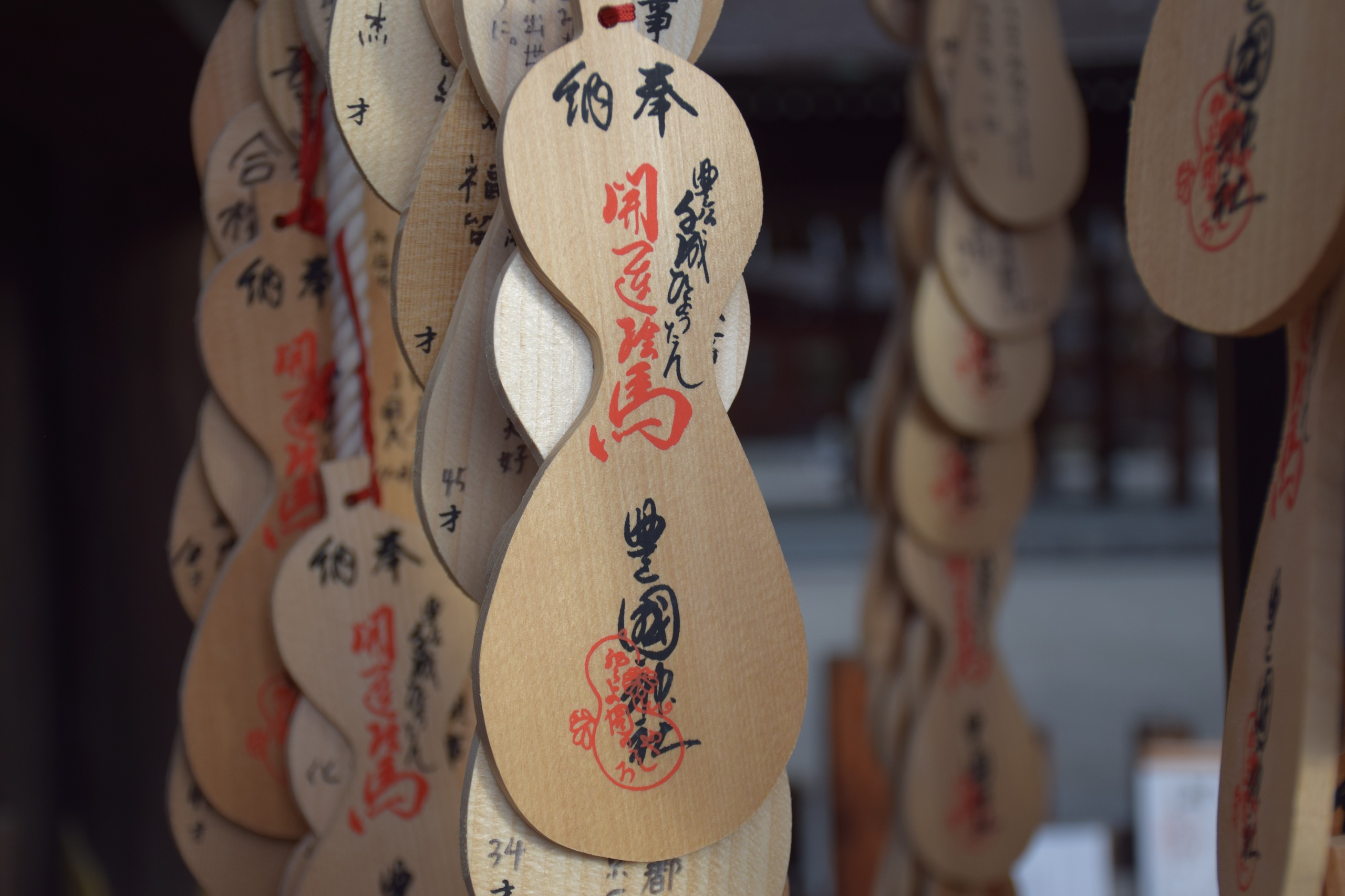 豊国神社は、豊臣秀吉を祀る神社です。出世開運・良縁成就のご利益で知られ、秀吉のシンボルであるひょうたんを模した絵馬が境内を彩ります。