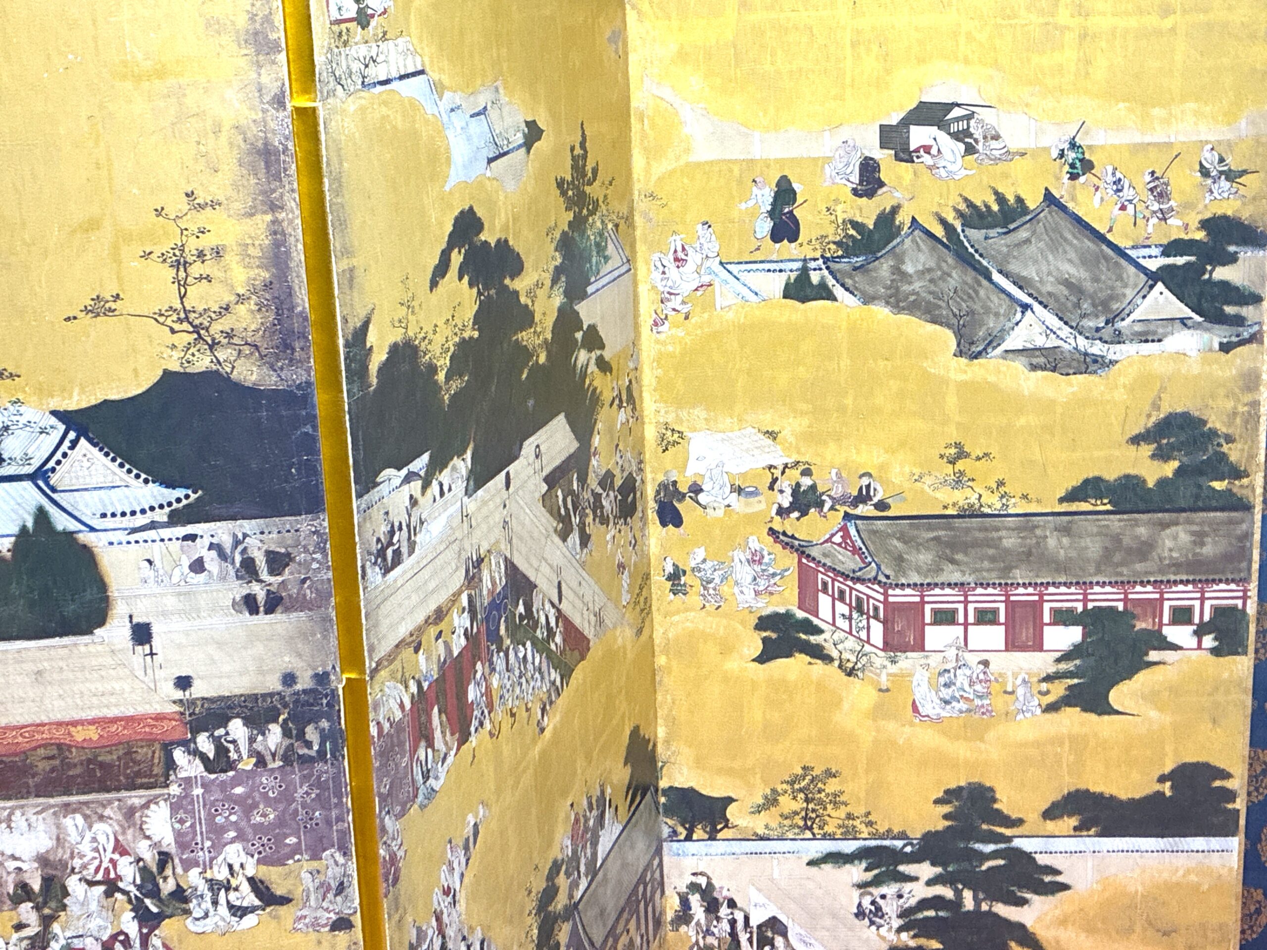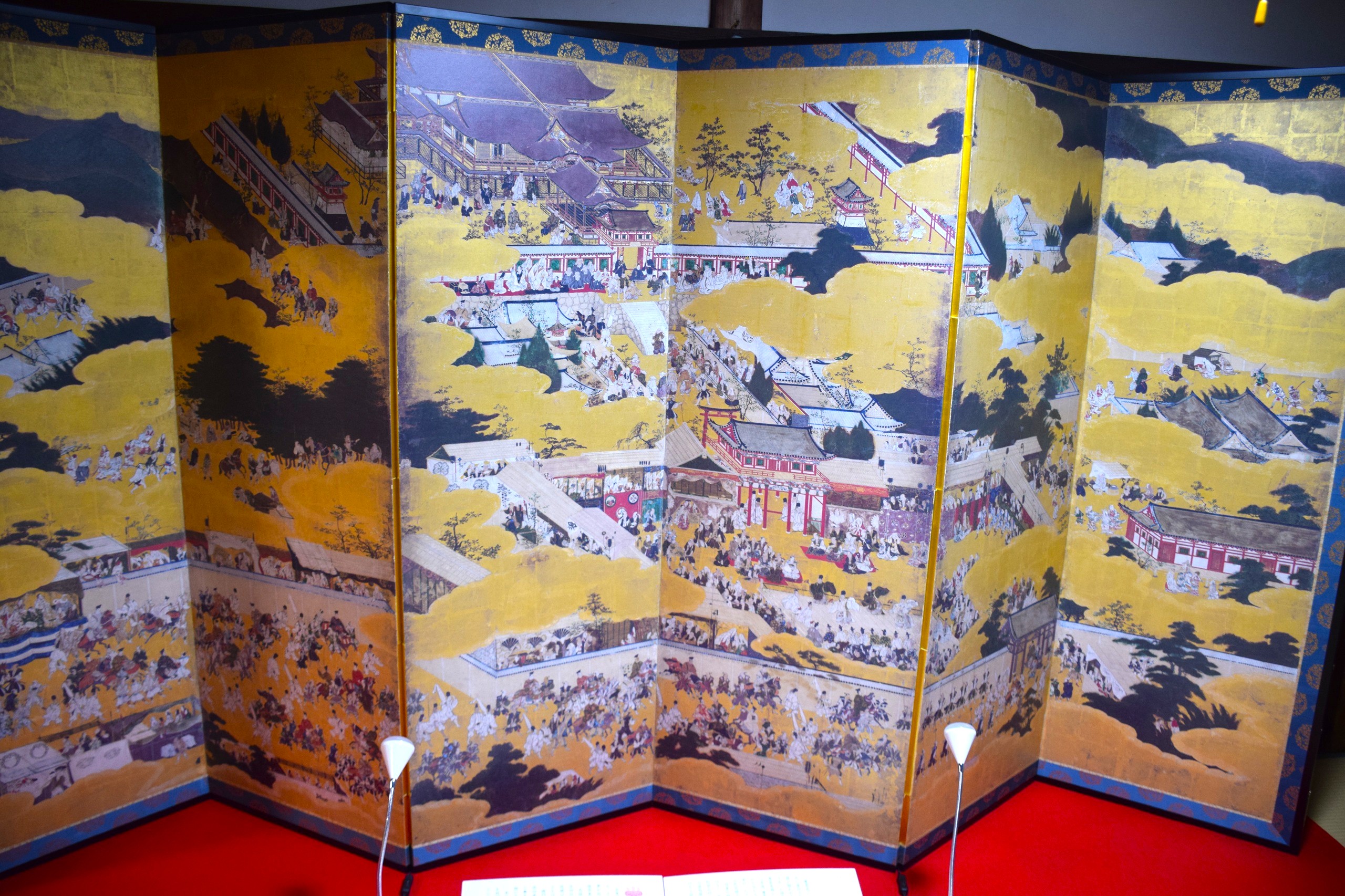 屏風は、秀吉の七回忌に行われた「豊国大明神臨時祭礼」の様子を描いたもので、豊臣家お抱えの画家である狩野内膳の作品です。当時の作品は、制作背景や制作意図がわからないことが一般的なため、それらがはっきりわかるという点でもかなり貴重な作品となっています。