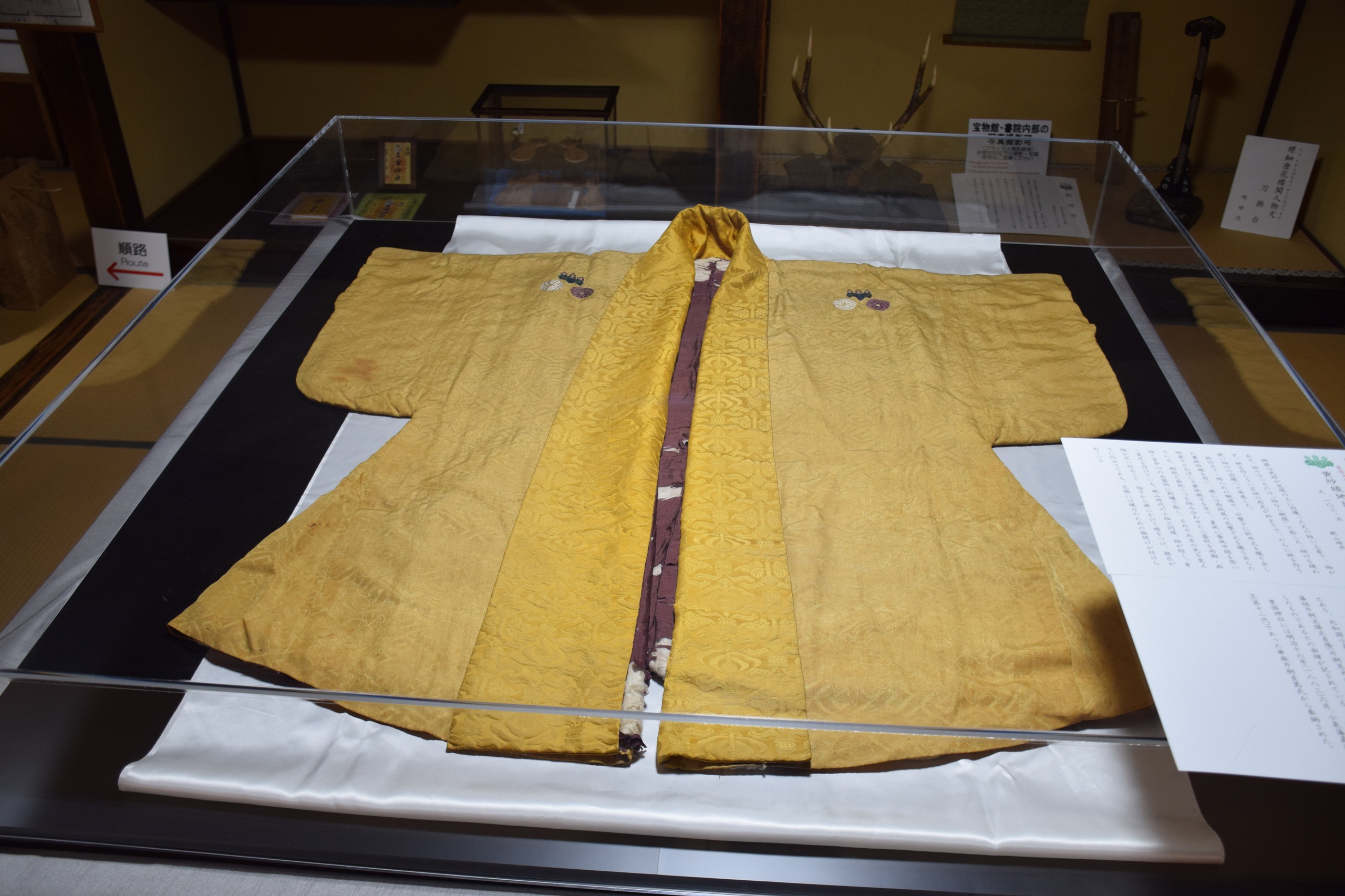 書院ではそのほかにも、秀吉が着ていたとされる重要文化財の「黄紗綾地菊桐紋付胴服(きさやじきくきりもんつきどうふく)」が展示されています。胴服は羽織の原型となった服で、中に綿が入っていて冬でも暖かいのだそうです。