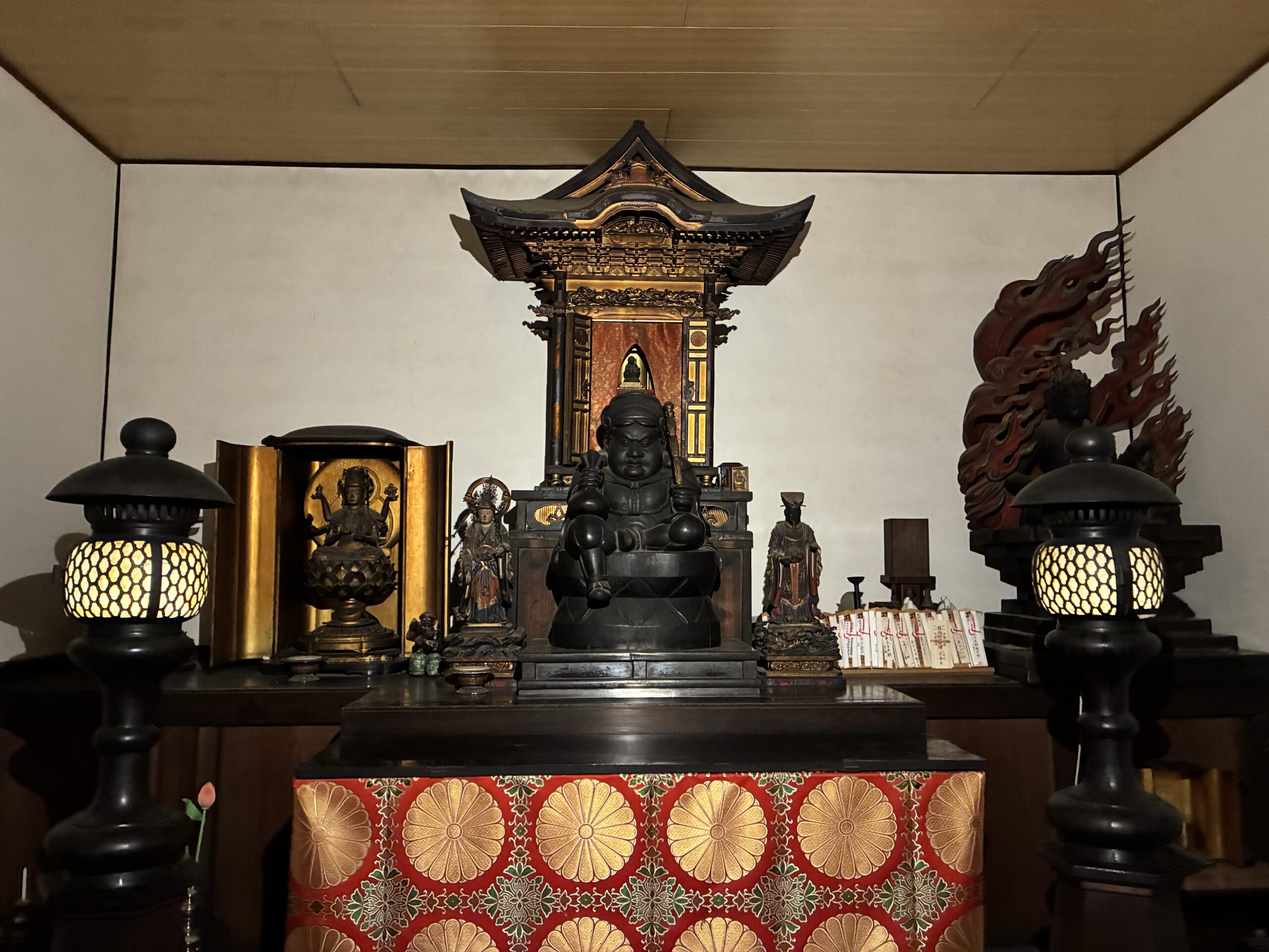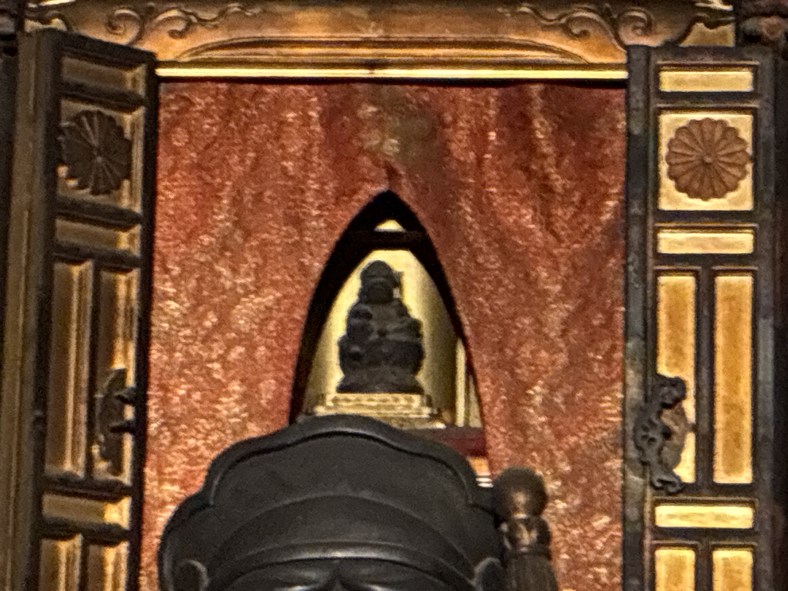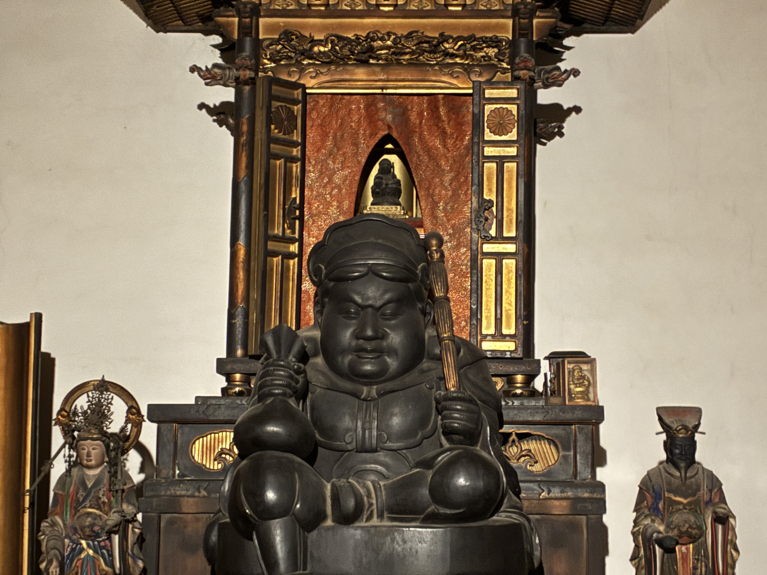 手前の黒い像は御前立(おまえだち)と呼ばれる、秘仏の代わりとなって参拝を受ける像で、大黒天像と同じ形をしています。