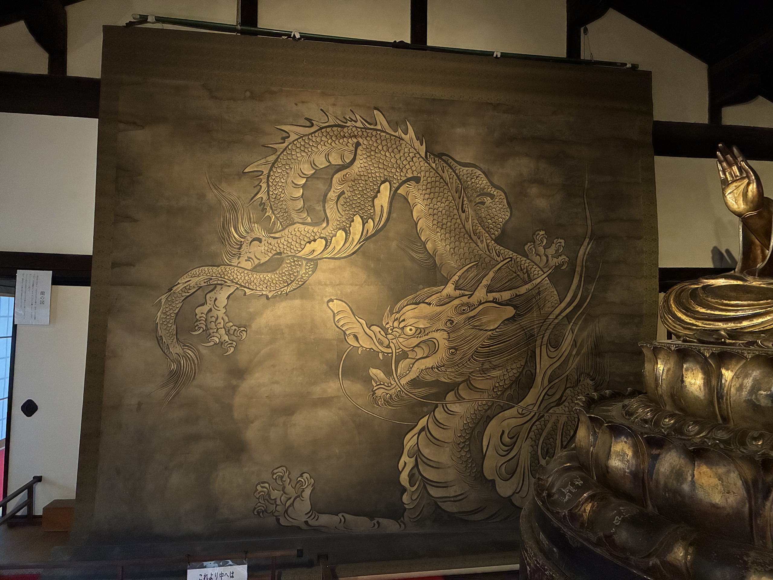 大黒堂の天井画として描かれた龍の図も特別展示されています。作者は明治時代の画家である吉川霊華。この龍の特徴は、上唇があがった独特の表情です。この描き方は古い龍図に用いられる表現で、あえて明治時代の流行に寄らず、古風な表現を選んでいる点が注目されています。