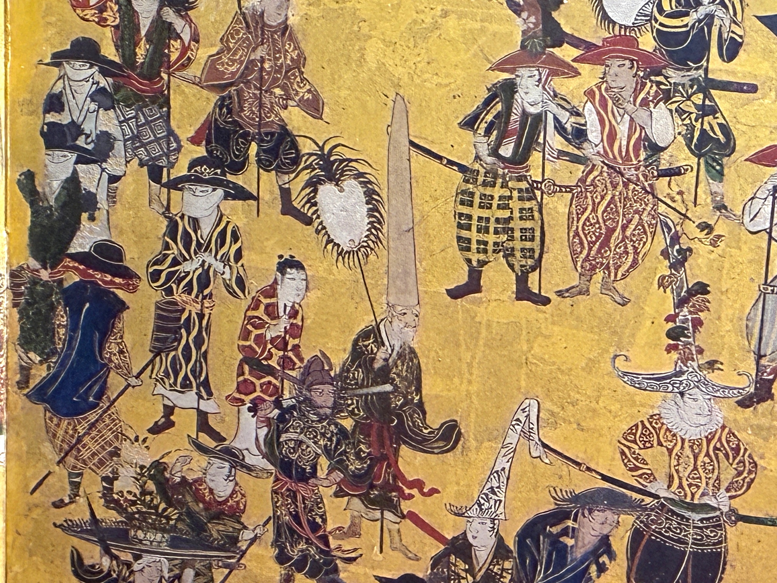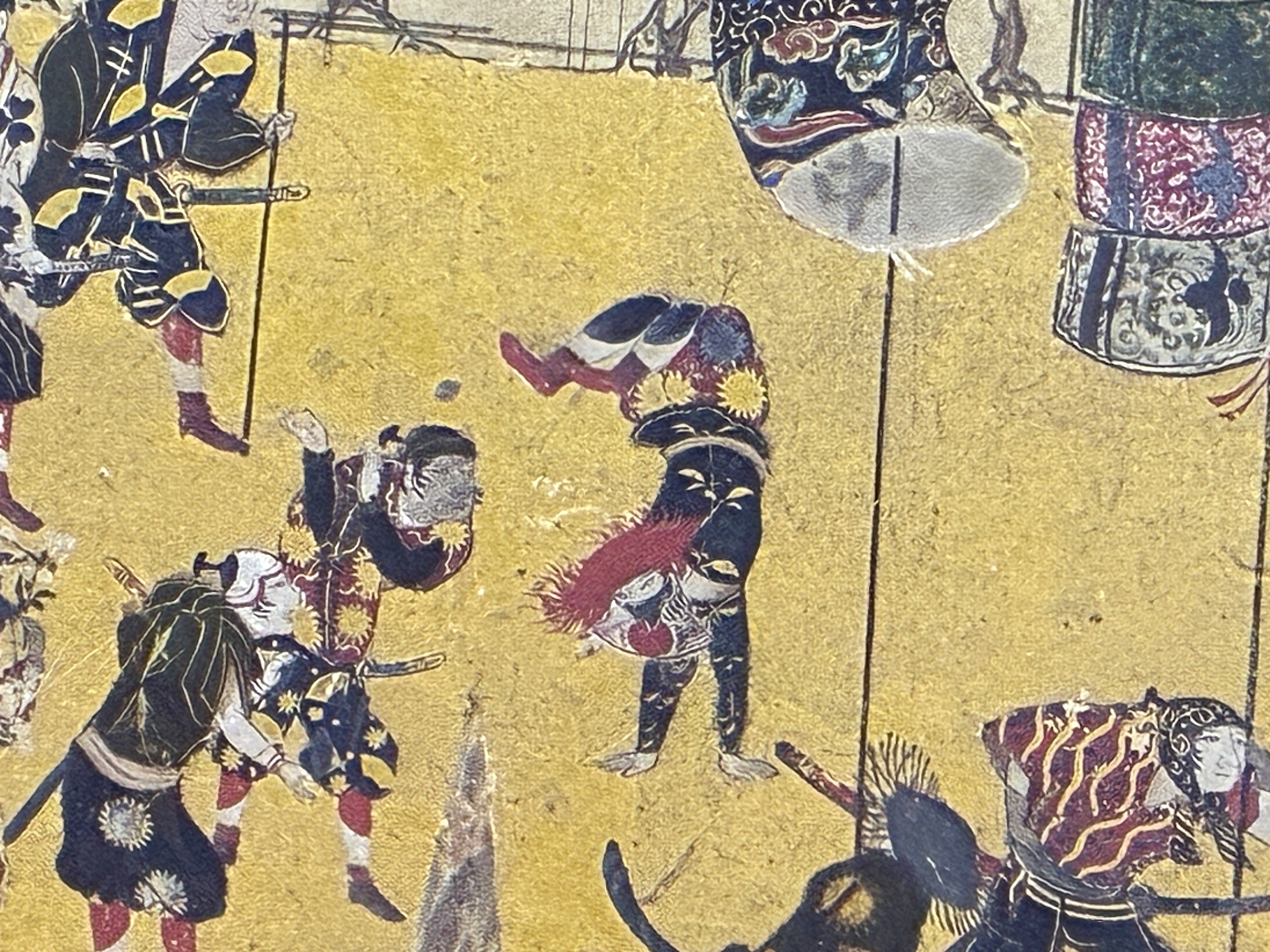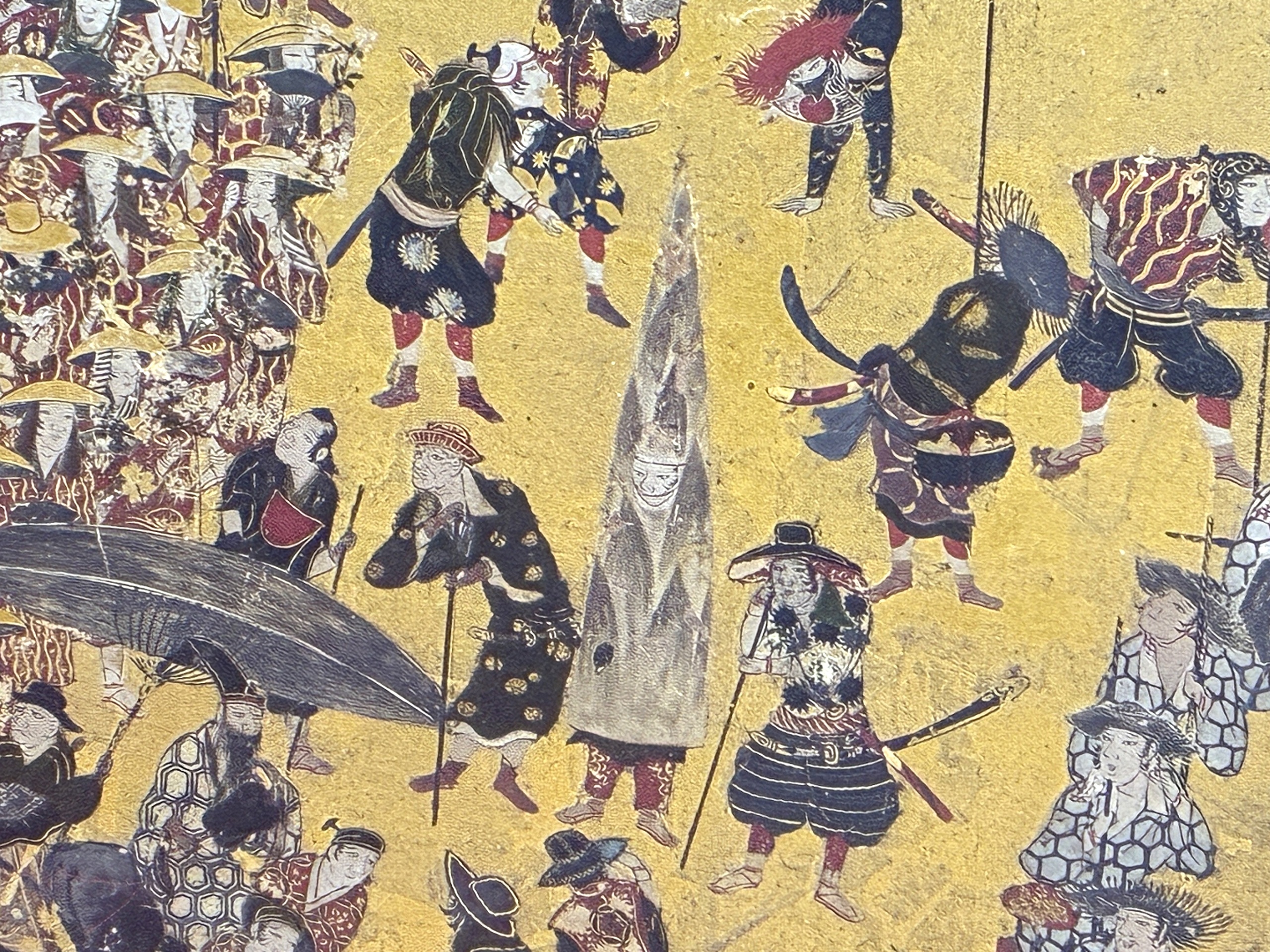 こちらの図屏風では風流踊りの様子が描かれています。風流踊りは、300人の踊り手が5組に分かれて行われる大規模な踊りで、盆踊りの原型とも言われています。遠目で見ても楽し気な様子が伝わってくる素晴らしい図屏風ですが、ぜひ近づいて踊っている人をひとり一人じっくり見てみてください。この風流踊りは趣向を凝らした衣装が特徴で、さまざまな仮装をした人が描かれており、当時の人たちの遊び心が伝わってきます。