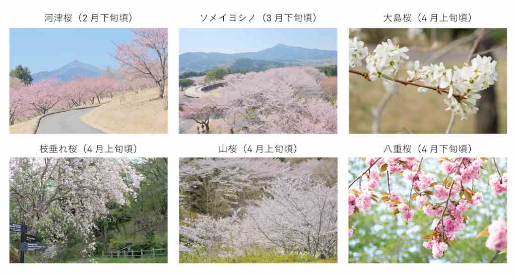 園内では、2月下旬頃から約250本の河津桜が咲き始めます。早咲きの河津桜を皮切りに、ソメイヨシノや大島桜、枝垂れ桜、山桜、そして八重桜へと次々に開花。園内を多彩な桜がリレーのように咲きつなぎ、4月下旬頃まで長くお花見シーズンを楽しめます。