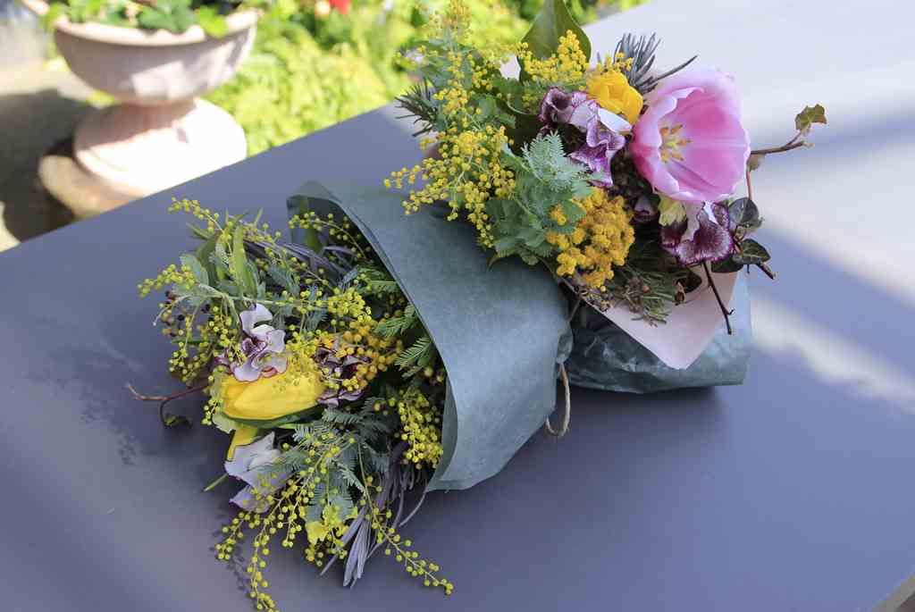 フローリストと一緒に、ミモザや春のお花とあわせてブーケを作る体験。