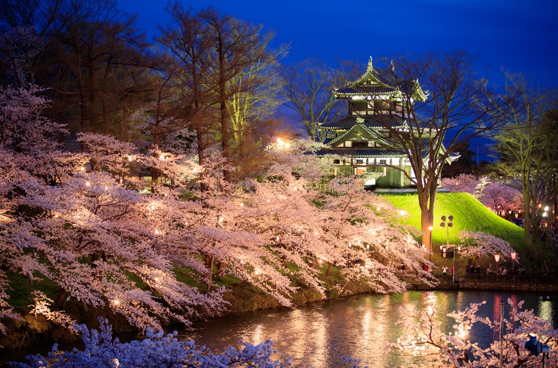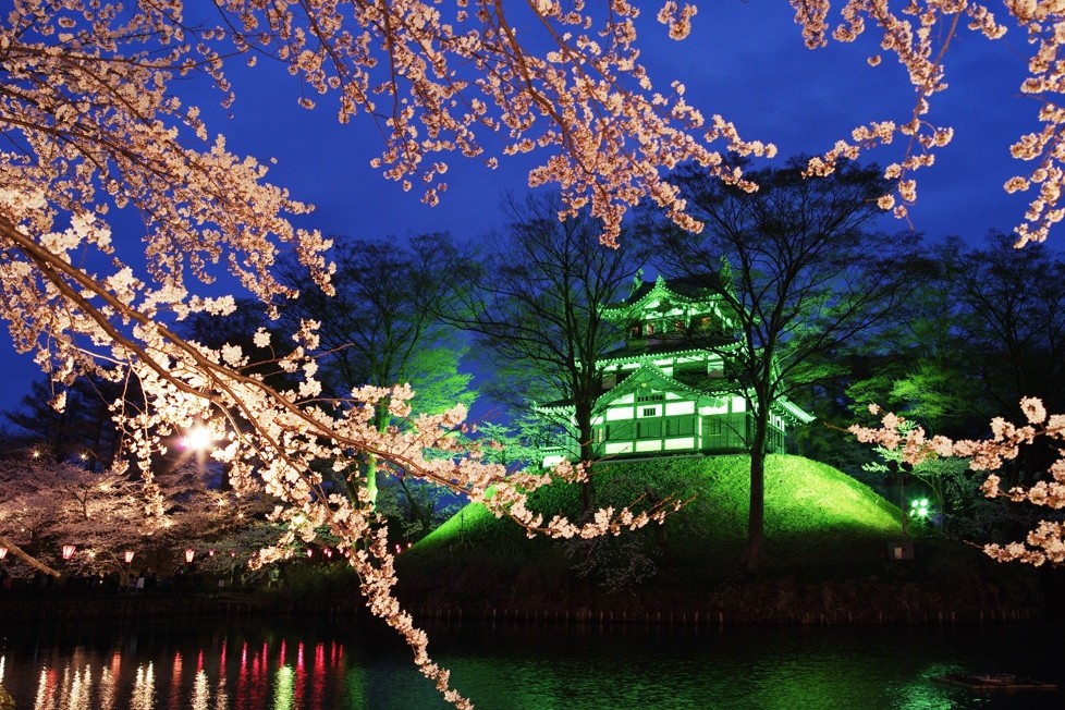 四季を通じてさまざまな表情を見せる高田城址公園は、春の桜の名所として有名。公園やその周辺を含めて約4000本の桜が咲き誇り、水面に映る三重櫓と桜の景色が広がります。三重櫓とともにボンボリの灯りに照らし出される美しさは、“日本三大夜桜”のひとつに数えられています。