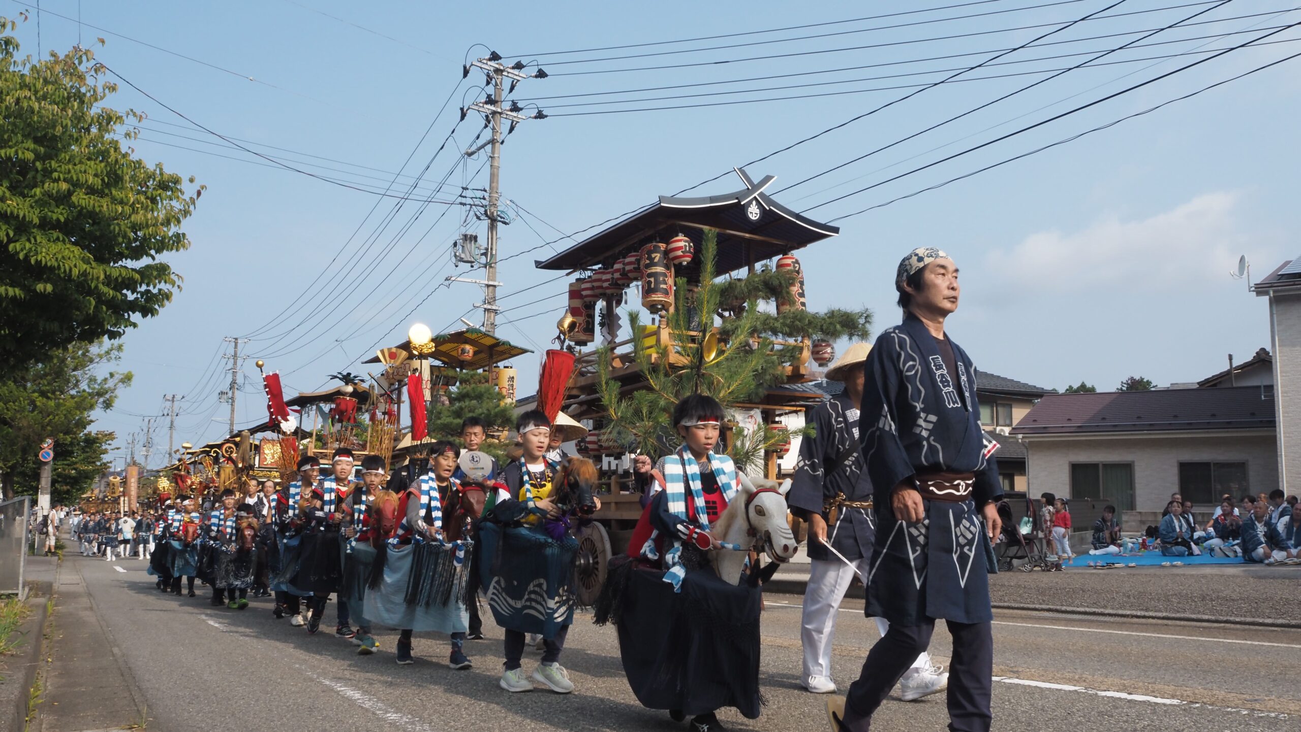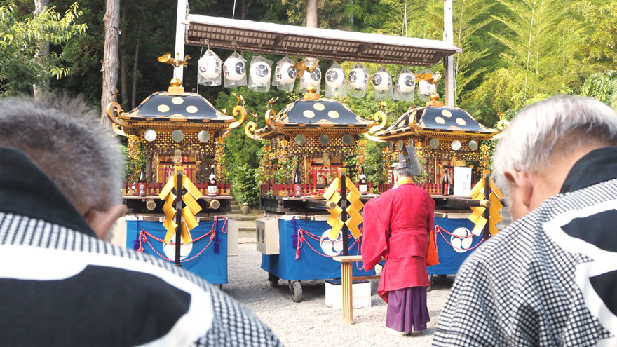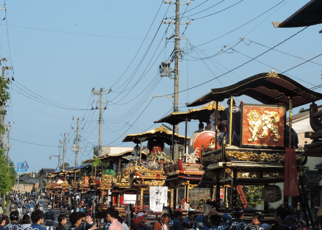毎年7月6日が宵祭り、7日が本祭り。3基の神輿に御神霊を奉遷して、荒馬14騎と稚児行列を先導に町内を巡行する「お旅神事」であり、特に本祭りの朝から行われる19台のおしゃぎりの巡行は城下町に響く囃子とともに進み、その光景は訪れた人の記憶に残ります。その名の由来は、歌舞伎や狂言で、鉦や太鼓で演奏される音曲やお囃子のことを“しゃぎり”と呼ぶところからとされています(※諸説あり)。