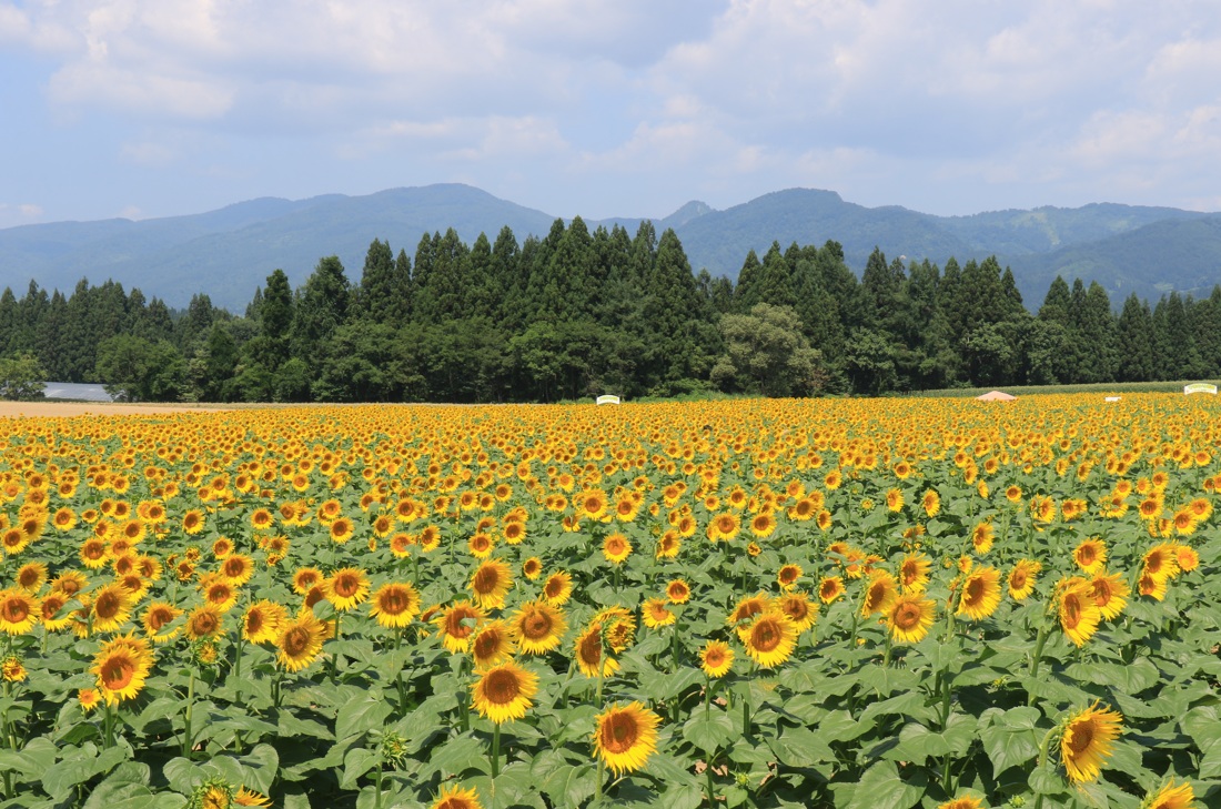 津南町のひまわり畑はかつて青年農業士(野菜研究会)のメンバーが、自らが楽しむために50アールの遊休農地を利用して作付けをしたのがはじまり。1993年から町の観光協会主催となり、現在では約4ヘクタールの面積に約50万本のひまわりが作付けされています。なお、2005年に津南町が制定50周年を迎え、住民投票によりひまわりは“町の花”となりました。