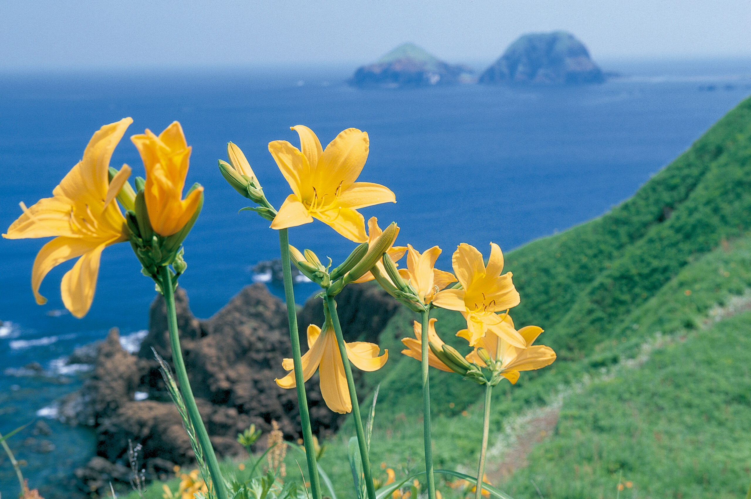 主な生育地は ”海の近くの断崖” です。『ミシュラン・グリーンガイド・ジャポン』二つ星として掲載された巨岩・秘境が佐渡の「大野亀」。標高167mの一枚岩が日本海に突き出している様は圧巻です。この地域は、100万本ものトビシマカンゾウの日本一の群生地。黄色い花が一面に広がり青い日本海と美しいコントラストを成す季節には、特に多くの人が訪れます。