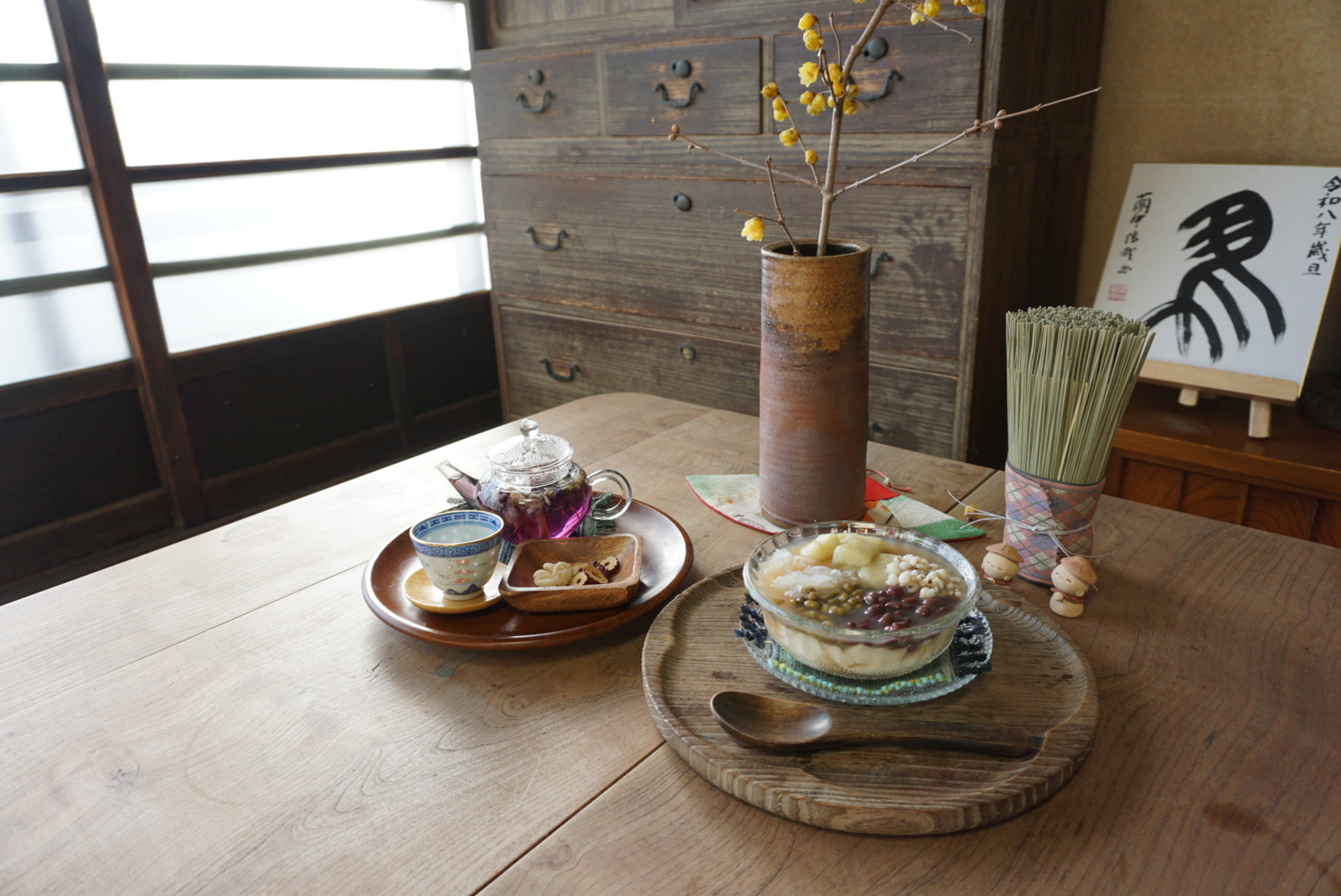 四萬部寺の境内には「お寺カフェ四萬部寺」もオープン。精進ランチ(予約制)や台湾スイーツの豆花、ハーブやドライフルーツなどをブレンドした八宝茶など、心と身体にしみるメニューをいただけます。