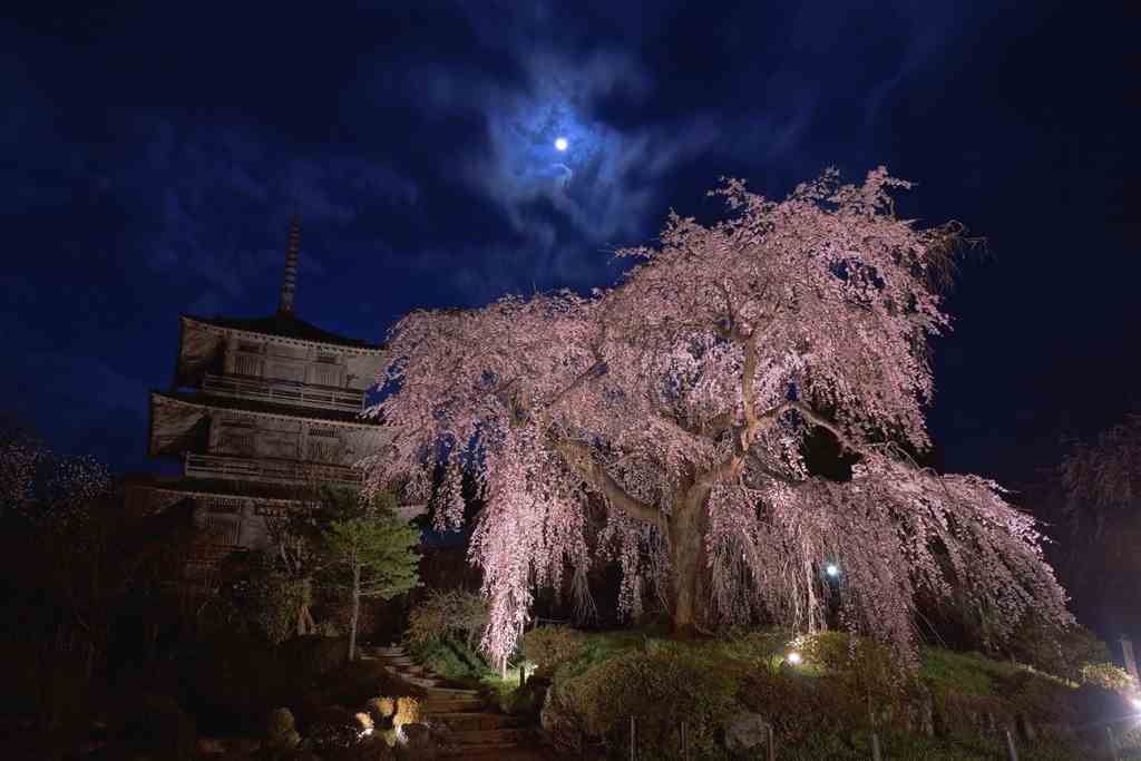 浄専寺は、約400年以上前、1615(元和元)年の開基とされる由緒ある古刹。樹齢約300年のしだれ桜は宮崎県の天然記念物に指定されています。この株から作られた苗は、五ヶ瀬町だけでも約300本が植えられ、3月下旬頃から淡紅色の花を咲かせます。開花期間中はライトアップされ幻想的な雰囲気になります。