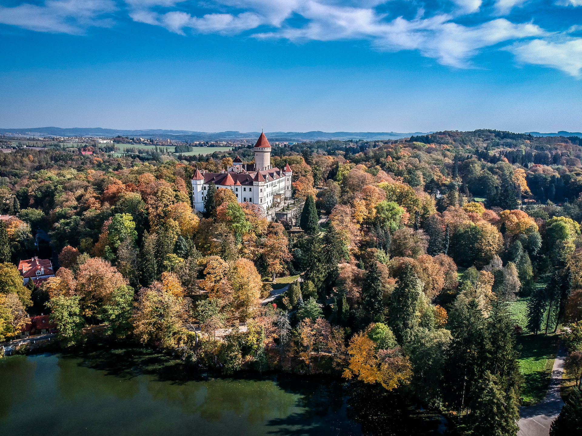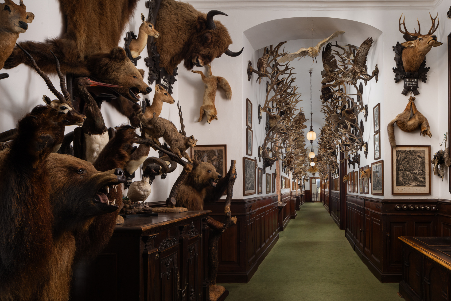 中央ボヘミア州の小都市、ベネショフBenešovの町外れに建つ古城です。13世紀後半に創建され、チェコやドイツの貴族の手に次々と渡った末、最後にオーストリアのフランツ・フェルディナント皇太子Franz Ferdinandが1887年に購入し城主となりました。城は最初ゴシック様式で建てられましたが、後にルネッサンス様式に改修。城内は当時のままに保存されていてギャラリーのようになっています。オーストリアの皇族が使っていた家具や芸術品、刀剣や銃器のコレクションも必見ですが、最も有名なのがフランツ・フェルディナントが趣味の狩猟で集めた獲物の剥製。生涯で約30万頭もの動物を狩ったとされ、壁一面に剝製や首印、シカの角などがびっしりと並びます。なかにはインドのトラやシベリアクマの剝製も。城の周りにはフランス式の庭園が広がり、また周辺の森林は公園として整備されています。