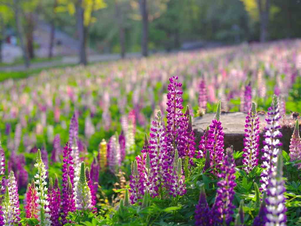 フジの花を逆さにしたような独特の形が印象的なルピナス。淡い紫やピンク、白の花々が並ぶ様子は、まるで物語のなかの風景を感じさせられます。木漏れ日のなかで揺れる姿は幻想的で、ゆっくりと散策しながら楽しみたいエリアです。