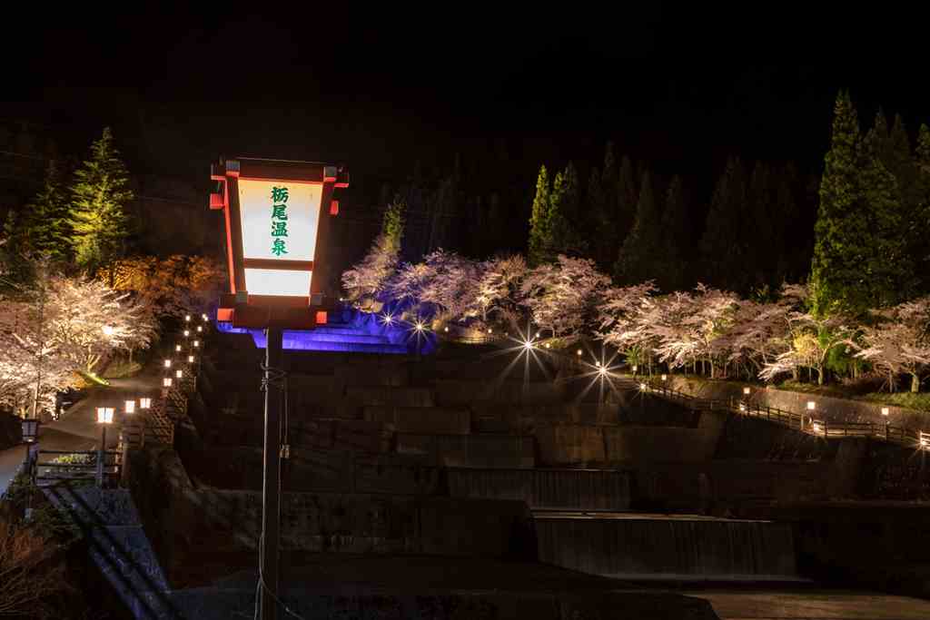 奥飛騨温泉郷のひとつである栃尾温泉では、洞谷橋周辺に広がる芝桜と桜の調和が魅力。夜はライトアップが行われ、昼間とは異なる幻想的な風景が広がります。静かな温泉地ならではの情緒あるひとときを満喫できます。