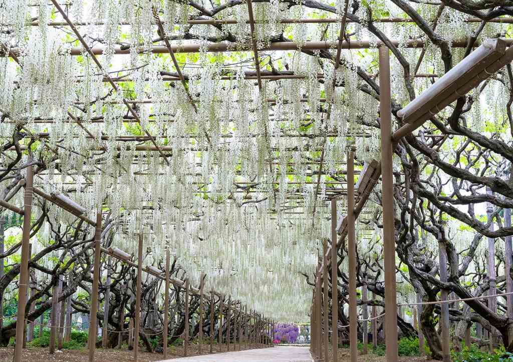 清楚な白藤は、さわやかで上品な印象。園内に広がる全長約80mの白藤トンネルは必見です。光に照らされるといっそう美しく、昼夜で異なる表情を楽しめます。