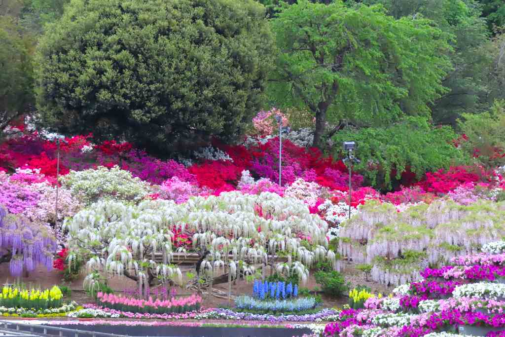 園内には藤だけではなく、5000株以上のツツジも咲き誇ります。色とりどりの花々が一面に広がり、春から初夏にかけて華やかな景色を楽しめます。