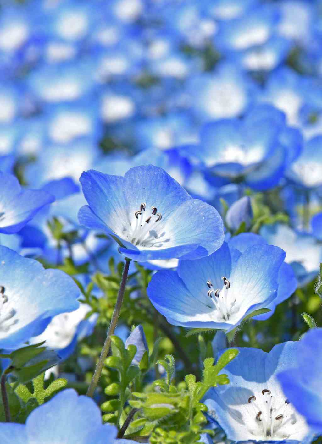 ネモフィラは、高さ10〜20cmほどの株に直径2〜3cmの小さな青い花を咲かせるのが特徴。和名の「瑠璃唐草」は、瑠璃色の花と唐草模様のような葉の形に由来しています。