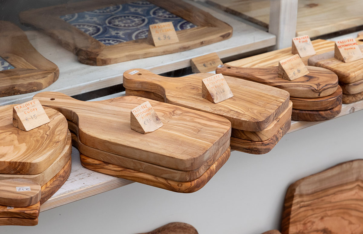 まな板としての役割はもちろん、サラミやチーズなどの加工品から本格的な牛肉のタリアータなど、料理を盛りつけてふるまうのにもぴったり。写真はローマのテスタッチョ市場で見つけたもの。さまざまな大きさのものがあり、ひとつ15ユーロ前後で購入できますよ。