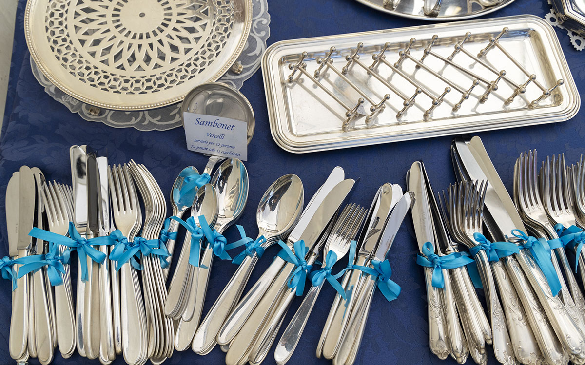 イタリア各地で開かれる骨董市では、アンティークの食器やカトラリーなども手に入れることができます。なかでも規模が大きいのは、ミラノで毎月最終日曜に開催されるナヴィリオ・グランデ骨董市。約300軒以上の骨董品販売業者や個人のコレクターが出店するということもあって、目当てのものがなくても十分楽しめます。特にスプーンやフォークなどのカトラリーは手軽に買うことができ、まとめ買いすると安くなることも。