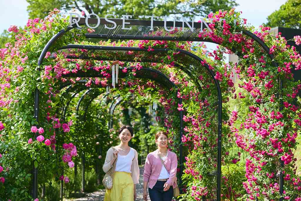 オリジナルのバラ「ユイット・カンパーニュ」から始まる、12品種・12色に包まれる華やかな全長60mのバラのトンネル。グラデーションカラーの花に囲まれた写真を撮れる人気のフォトスポットです。