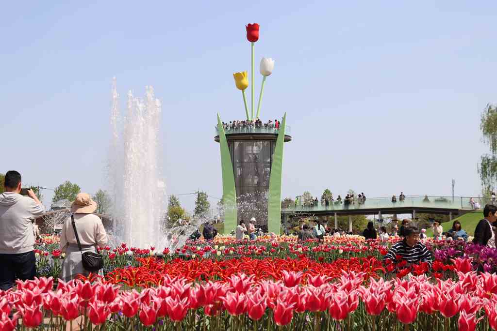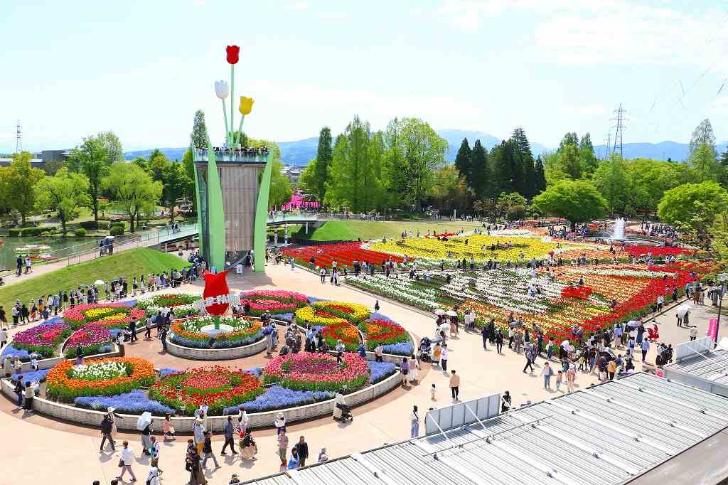大花壇の地上絵や円形花壇、チューリップタワーなど、園内全体を見渡せる人気のビュースポット。色とりどりのチューリップが広がる花の絶景を楽しめます。また、晴れた日には立山連峰も見られます。