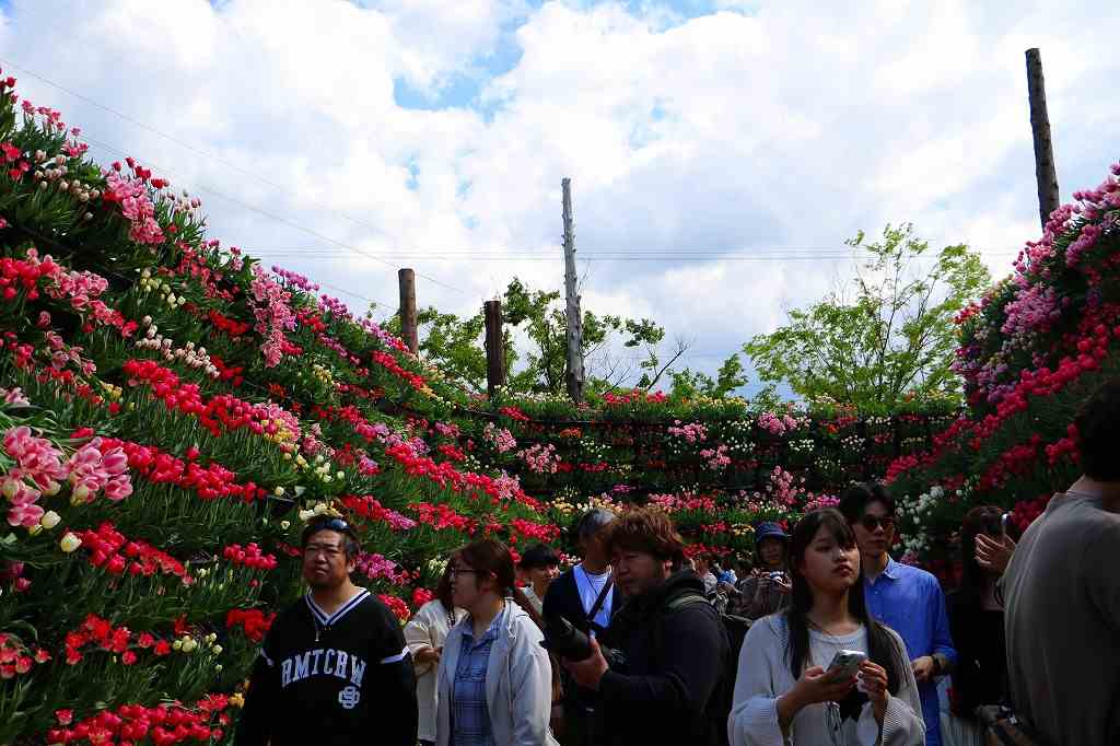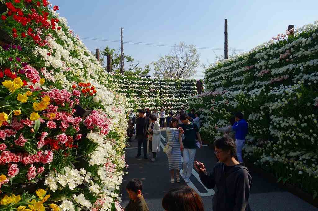 「花の大谷」は、富山県を代表する景観地・立山黒部アルペンルートの「雪の大谷」をイメージした、高さ約4mのチューリップ回廊。会期の前半と後半で異なる景観が楽しめるのも魅力です。前半は白いチューリップで雪の壁を、後半は色とりどりのチューリップで春爛漫の風景を演出します。